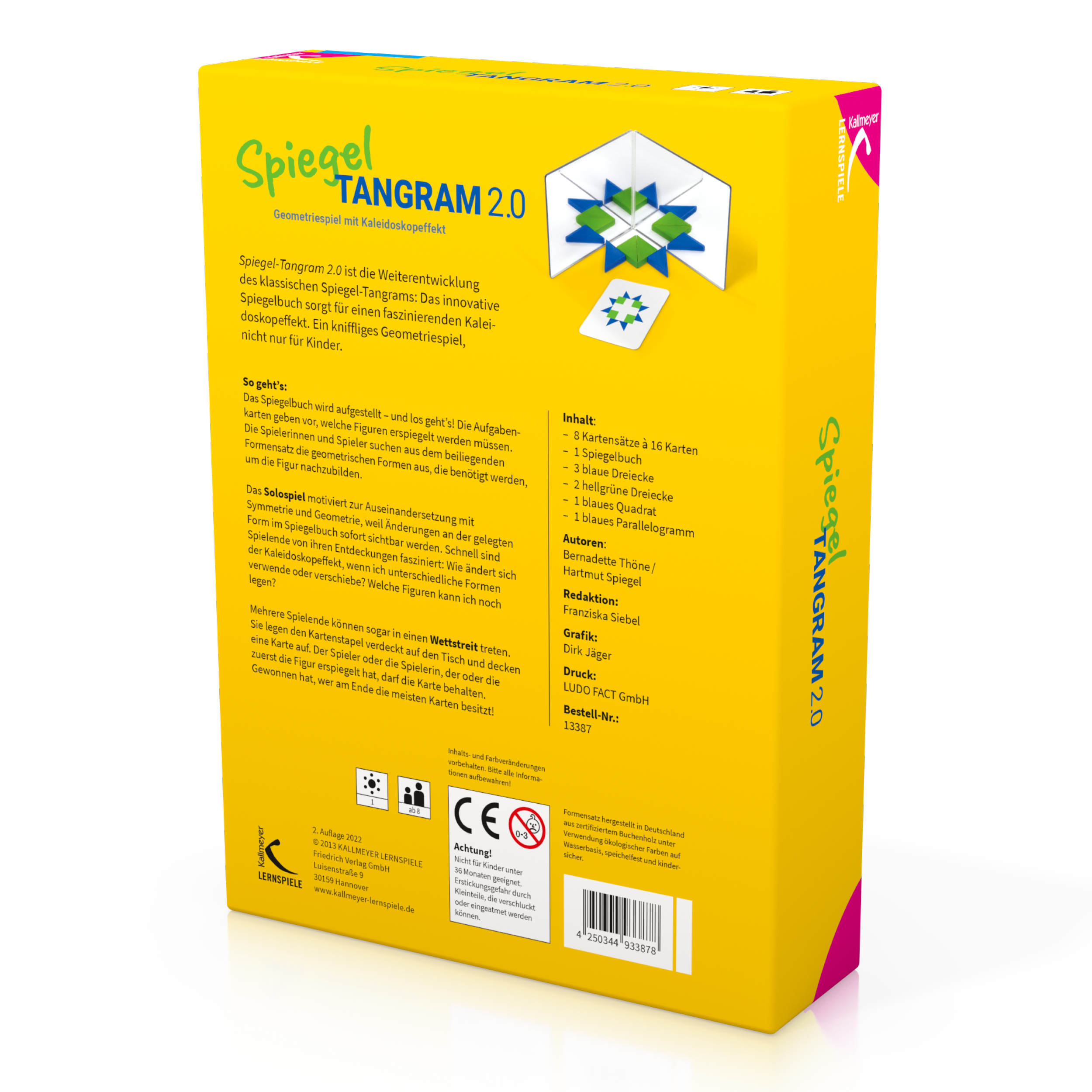 „Spiegel Tangram 2.0 baut auf dem bekannten Spiel ‚Spiegel Tangram‘ aus der Reihe Kallmeyer Lernspiele auf. Nun sollen geometrische Plättchen so in den Winkel gelegt werden, dass das Muster auf der Spielkarte komplettiert wird. Das ist ganz schön kniffelig und auch so mancher Erwachsener wird etwas zu Knobeln haben.“
