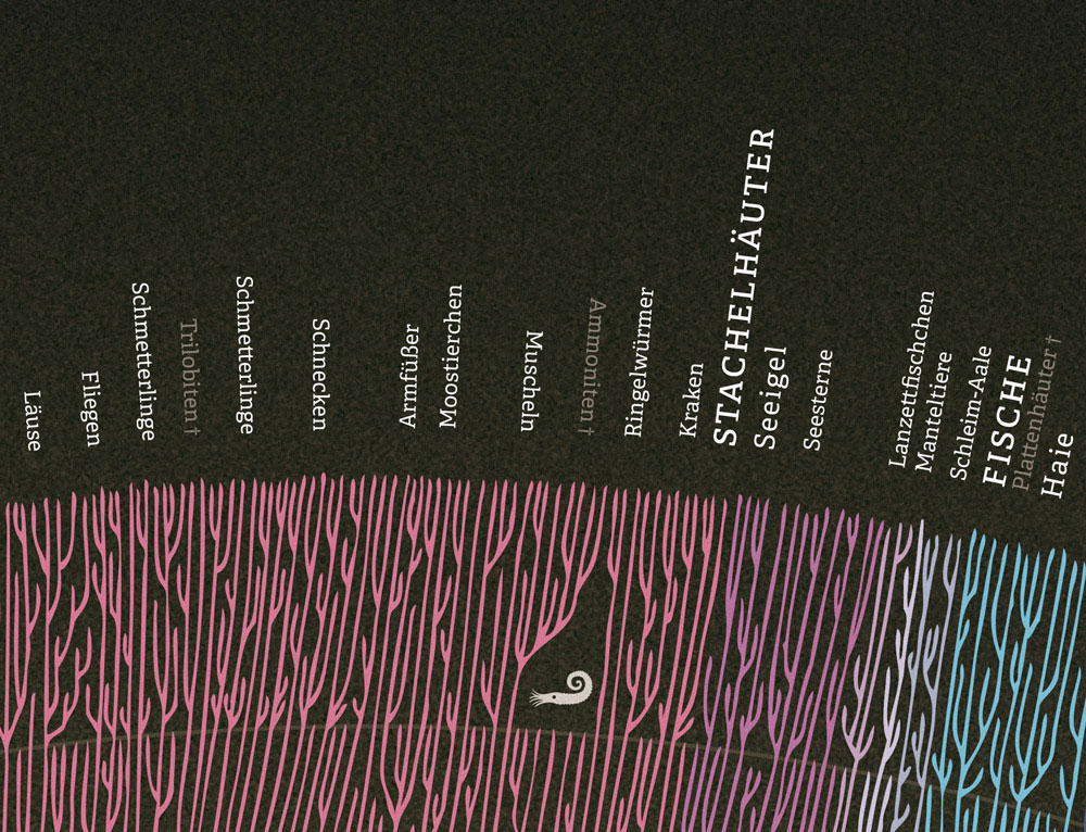 Der Stammbaum der Lebewesen zeigt eindrucksvoll, dass jede Art, die jemals gelebt hat, mit jeder beliebigen anderen Art über einen gemeinsamen Vorfahren verwandt ist. Paradoxerweise sind die großen Massensterben die großen Motoren der Evolution und bringen eine große Anzahl neuer Arten hervor. Diese Darstellung sollte in keinem Biologiesaal fehlen.