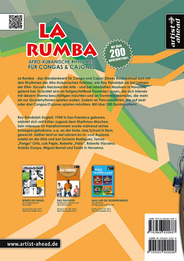 Das Standardwerk für Conga und Cajon. Dieses Buch befasst sich mit den Rhythmen der Afro-Kubanischen Folklore, wie Roy Randolph sie bei Lehrern der ENA (Escuela Nacional del Arte) und bei namhaften Musikern in Havanna gelernt hat. Es richtet sich an fortgeschrittene Trommler/-innen, die sich intensiv mit diesem Thema beschäftigen möchten und an Trommelensembles, die mehr als nur Grundrhythmen spielen wollen. Zudem an Percussionisten, die auf zwei oder drei Congas/Cajones spielen möchten. Mit über 200 Quintopattern!