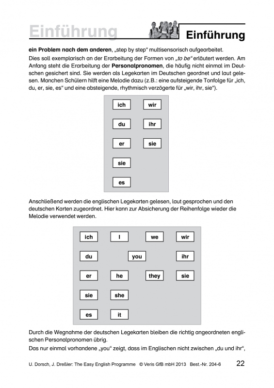 The Easy English Programme ist ein elementares, strukturiertes und schulbegleitendes Förderprogramm für Schüler*innen ab der 5. Klasse mit Lese-Rechtschreibproblemen und eignet sich für alle Schulkinder, die stärkere Strukturen beim Erlernen der Fremdsprache Englisch benötigen. Es führt jedes Thema vom Einfachen zum Schweren Schritt für Schritt parallel zum Unterricht ein. So erlebt das Kind Erfolge und stärkt sein Selbstvertrauen.Denn nur ein Kind, das an sich selbst glaubt, kann Leistungen erbringen!Englisch ist nicht lautgetreu!Daher hilft die mühsam im Deutschen gelernte Rechtschreibung nicht weiter.Aus diesem Grund wurde das Graphem-Phonem-Konzept entwickelt, bei dem, losgelöst von der Lautschrift, der englischen Graphemschreibung bekannte deutsche Lautentsprechungen zugeordnet werden. Auf der Basis wird das Vokabular des Schulunterrichts strukturiert und systematisch gelernt sowie mit Diktaten an der Null-Fehler-Grenze gefestigt. Die Grammatik wird grundlegend aufgebaut. Sämtliche Themen des Anfangsunterrichts weiterführender Schulen werden behandelt.In 38 genauen Stundenabläufen sind neben ausführlichen Anweisungen zur Durchführung alle Materialien zur Arbeit mit dem Programm enthalten.Jede Stunde gliedert sich in einen Rechtschreib- und Grammatikteil, in dem strukturiert Neues erarbeitet und Bekanntes gesichert wird.Die Arbeitsblätter, Vokabelkarten und Legekarten erlauben einen handlungsorientierten, motivierenden Einsatz, losgelöst von der Rechtschreibung. Anschließend wird dieses "Sprachhandeln" auf den Arbeitsblättern angewandt, geübt und gefestigt.Aus dem Inhalt:- Vorwort- Einführung- Die Grundlagen der Förderung- Das Förderkonzept- Die Arbeit mit dem Programm- Individualisierung- Fragen und Antworten zur Anwendung des Förderprogramms- Literaturverzeichnis- Wörterlisten- Stundenabläufe (Lesson 1 bis Lesson 38)- Übungsaufgaben 1 - Lessons 1-19- Übungsaufgaben 2 - Lessons 20-38- Anhang- Legekarten- Graphem-Phonem-Verbindungen (Vorlagen und Tabellen zum Eintragen 1-38- Arbeitsblätter- Grammatikkarten- Vokabelkarten