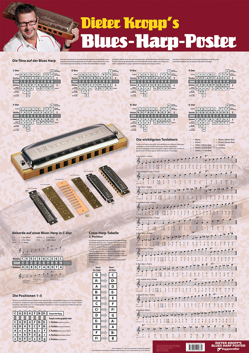 Weitere Infos, beispielhaft für die C-Harp angegeben, sind die wichtigsten Tonleitern und Akkorde sowie Tabellen für das Cross-Harp-Spiel und die verschiedenen Positionen auf der Harp.