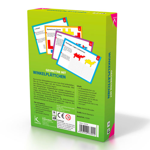 Die zu den Winkelplättchen gehörende Aufgabenkartei enthält Aufgabensequenzen zu sechs wesentlichen Themen des Geometrieunterrichts in der Grundschule: Legen, Auslegen, Nachlegen / Achsensymmetrie / Drehsymmetrie / Bandornamente / Parkette / Flächeninhalt und Umfang. Die Aufgaben sind nach Schwierigkeitsgrad eingestuft, wobei die Kinder in der Regel zunächst zum freien Legen und Gestalten aufgefordert werden. Hierbei entfalten die Schülerinnen und Schüler ihr kreatives Potential und haben Spaß an Mustern, Formen und Farben.