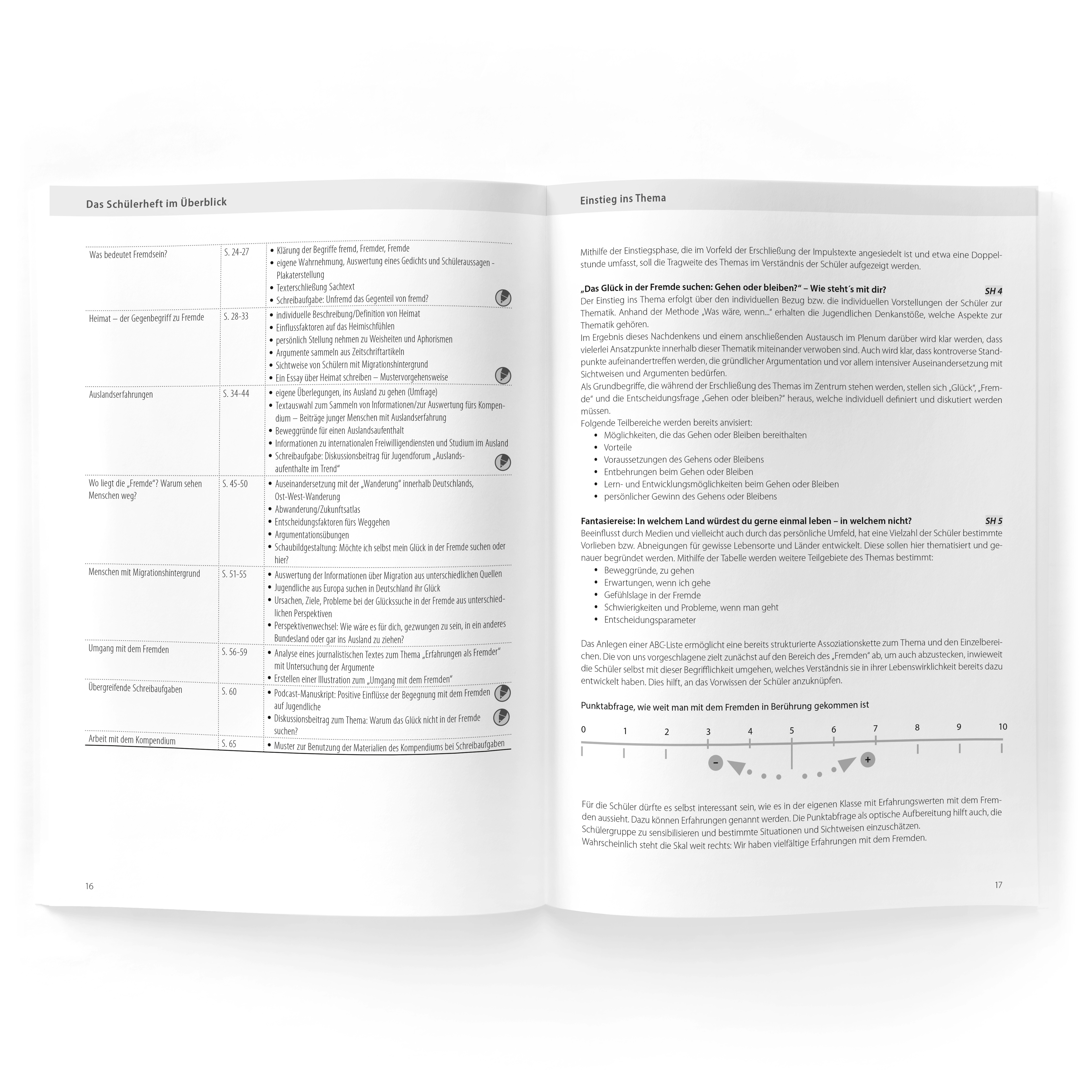 Lehrer- und Schülerheft thematisieren die Frage, weshalb Menschen ihr Glück in der Fremde suchen. Die Thematik zielt nicht nur auf die Entwicklung der sprachlichen Kompetenz im Bereich des adressatengebunden Schreibens, sondern sensibilisiert auch für die interkulturellen Kompetenzen, hier besonders den verständnisvollen Umgang mit kultureller Differenz. Zugleich ermöglicht das Material eine Orientierung Jugendlicher im Dschungel der Möglichkeiten, eigene Lebensperspektiven nach dem Schulabschluss zu planen und zu organisieren. Dabei helfen anschauliche Darstellungen der Erfahrungen Jugendlicher, die sich für einen bestimmten Zeitraum in die Fremde begeben haben. Das Lehrerheft enthält - Annäherung an das Thema und Begrenzung - Recherche als Wissensgrundlage - Anlage und Nutzung des Kompendiums - Fremd sein - Fremde und Heimat - Glück in der Fremde? - Auslandsaufenthalt für Schüler und nach dem Abschluss - Auswandern - Migration - Umgang mit dem Fremden - Schreibaufgaben und Ergänzungsmaterialien Der ausführliche Unterrichtsteil bezieht das Schülerheft mit ein, sodass verschiedene Kompetenzbereiche trainiert werden: - Auswertung von Texten und Statistiken, systematische Informationsentnahme - eigene Argumentationen in Form von Schreibaufgaben verfassen - Lösungsvorschläge, Vorbereitung auf Tests und Prüfung - Präsentation und Mediennutzung Dem Lehrerheft ist eine Materialien-CD zur Thematik und zur Übung von Argumentationen beigelegt. Dies ermöglicht Differenzieren und selbstständiges Üben. Das Schülerheft enthält - Gedanken zum Thema - Impulstexte auswerten - recherchieren, Kompendium anlegen, organisieren und nutzen - Was bedeutet Glück? - Was bedeutet fremd sein? - Heimat im Gegensatz zur Fremde - Nach der Schule ins Ausland? - Auswanderer auf Zeit - Beweggründe für einen Auslandsaufenthalt - Erfahrungsberichte - Fremde ist nicht nur Ausland - Migration in Deutschland - aus der Fremde in die Fremde - Schreibaufgaben (Diskussion, Podcast ...)