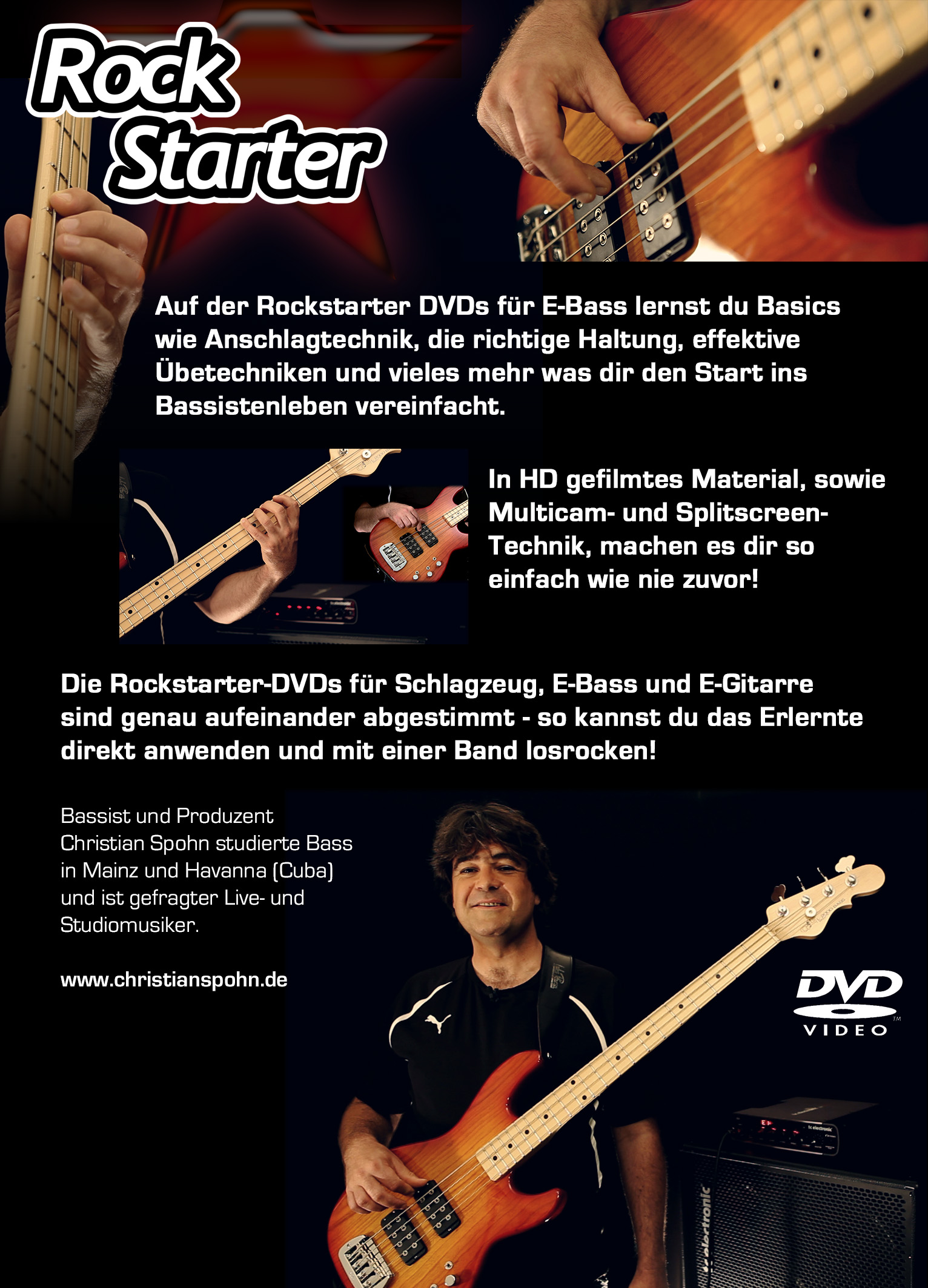 Die Rockstarter-DVDs Vol. 1, 2 und 3 im Komplettset, drei DVDs zum Hammerpreis!Auf den Rockstarter-DVDs für E-Bass lernst du Basics wie Power-Chords, Anschlagtechnik, die richtige Haltung, effektive Übetechniken (Vol.1), weiterführend dann viele neue Techniken und neue Grooves (Vol.2) und schließlich 16tel Grooves, deine erste Tonleiter, Fills und eine Einführung in Picking- und Slaptechnik (Vol.3). In HD gefilmtes Material, sowie Multicam- und Splitscreen-Technik machen es dir so einfach wie nie zuvor! Die Rockstarter-DVDs für Schlagzeug, E-Bass und E-Gitarre sind genau aufeinander abgestimmt - so kannst du das Erlernte direkt anwenden und mit einer Band losrocken! Die perfekten Lehr-DVDs um erfolgreich und mit einer Menge Spaß dein Lieblingsinstrument zu erlernen!
