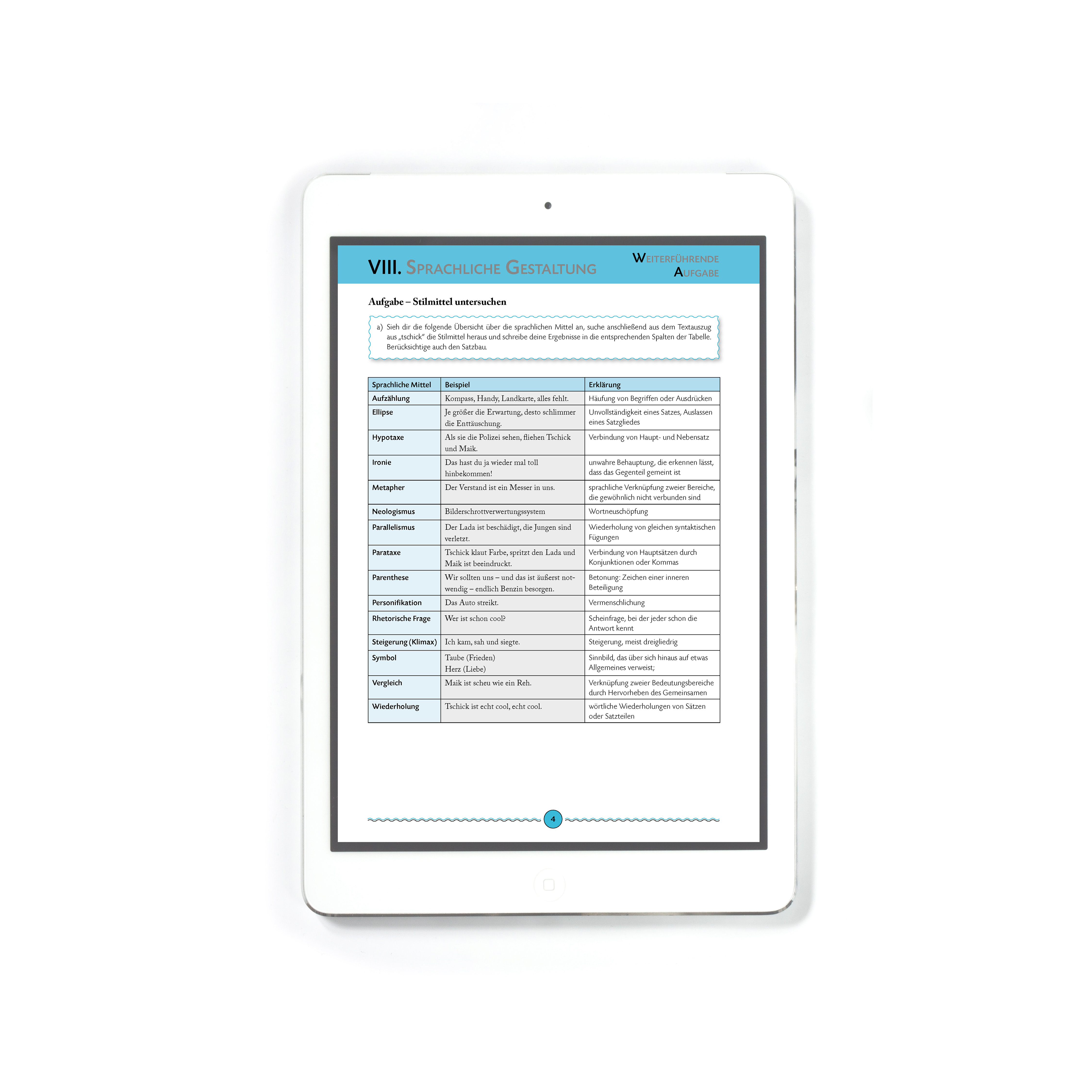 | Schlagworte | Abschlussprüfung • Arbeitsauftäge • Arbeitsaufträge • Differenzierung • Freundschaft • Hauptschule • Herrndorf, Wolfgang; Unterrichtsmaterialien • Hilfestellungen • Intensivierung der Auseinandersetzung • Kopiervorlagen • Lada • Realschule • Roadtrip • Saarland • schwächere Lerngruppen • Schwächere Schüler • Sekundarstufenunterricht I • tschick • Tschick (Herrndorf) • Unterricht • Unterrichtsmaterialien • Unterricht und Didaktik: Erstsprache: Lesekompeten • Unterricht und Didaktik: Erstsprache: Literatur • Unterricht und Didaktik: Erstsprache: Schreibkompe • Unterricht und Didaktik: Erstsprache: Sprechkompet • Unterricht und Didaktik: Lehrbücher • Wolfgang Herrndorf |