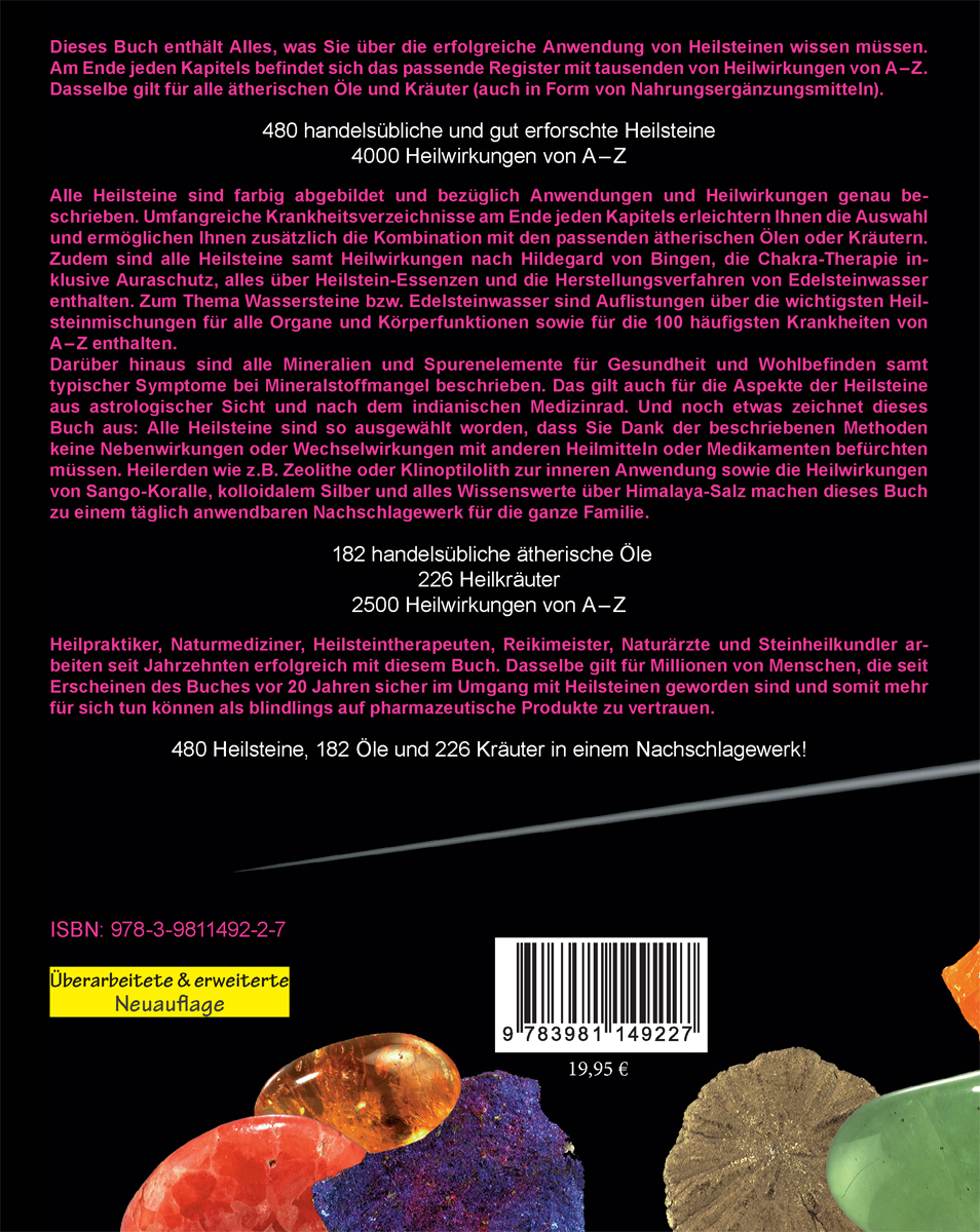 Dieses Buch enthält Alles, was Sie über die erfolgreiche Anwendung von Heilsteinen wissen müssen. Am Ende jeden Kapitels befindet sich das passende Register mit tausenden von Heilwirkungen von A - Z. Dasselbe gilt für alle ätherischen Öle und Kräuter (auch in Form von Nahrungsergänzungsmitteln).480 handelsübliche und gut erforschte Heilsteine 4000 Heilwirkungen von A - ZAlle Heilsteine sind farbig abgebildet und bezüglich Anwendungen und Heilwirkungen genau beschrieben. Umfangreiche Krankheitsverzeichnisse am Ende jeden Kapitels erleichtern Ihnen die Auswahl und ermöglichen Ihnen zusätzlich die Kombination mit den passenden ätherischen Ölen oder Kräutern. Zudem sind alle Heilsteine samt Heilwirkungen nach Hildegard von Bingen, die Chakra-Therapie inklusive Auraschutz, alles über Heilstein-Essenzen und die Herstellungsverfahren von Edelsteinwasser enthalten. Zum Thema Wassersteine bzw. Edelsteinwasser sind Auflistungen über die wichtigsten Heilsteinmischungen für alle Organe und Körperfunktionen sowie für die 100 häufigsten Krankheiten von A - Z enthalten. Darüber hinaus sind alle Mineralien und Spurenelemente für Gesundheit und Wohlbefinden samt typischer Symptome bei Mineralstoffmangel beschrieben. Das gilt auch für die Aspekte der Heilsteine aus astrologischer Sicht und nach dem indianischen Medizinrad. Und noch etwas zeichnet dieses Buch aus: Alle Heilsteine sind so ausgewählt worden, dass Sie Dank der beschriebenen Methoden keine Nebenwirkungen oder Wechselwirkungen mit anderen Heilmitteln oder Medikamenten befürchten müssen. Heilerden wie z.B. Zeolithe oder Klinoptilolith zur inneren Anwendung sowie die Heilwirkungen von Sango-Koralle, kolloidalem Silber und alles Wissenswerte über Himalaya-Salz machen dieses Buch zu einem täglich anwendbaren Nachschlagewerk für die ganze Familie. 182 handelsübliche ätherische Öle 226 Heilkräuter 2500 Heilwirkungen von A - ZHeilpraktiker, Naturmediziner, Heilsteintherapeuten, Reikimeister, Naturärzte und Steinheilkundler arbeiten seit Jahrzehnten erfolgreich mit diesem Buch. Dasselbe gilt für Millionen von Menschen, die seit Erscheinen des Buches vor 20 Jahren sicher im Umgang mit Heilsteinen geworden sind und somit mehr für sich tun können als blindlings auf pharmazeutische Produkte zu vertrauen.480 Heilsteine, 182 Öle und 226 Kräuter in einem Nachschlagewerk!