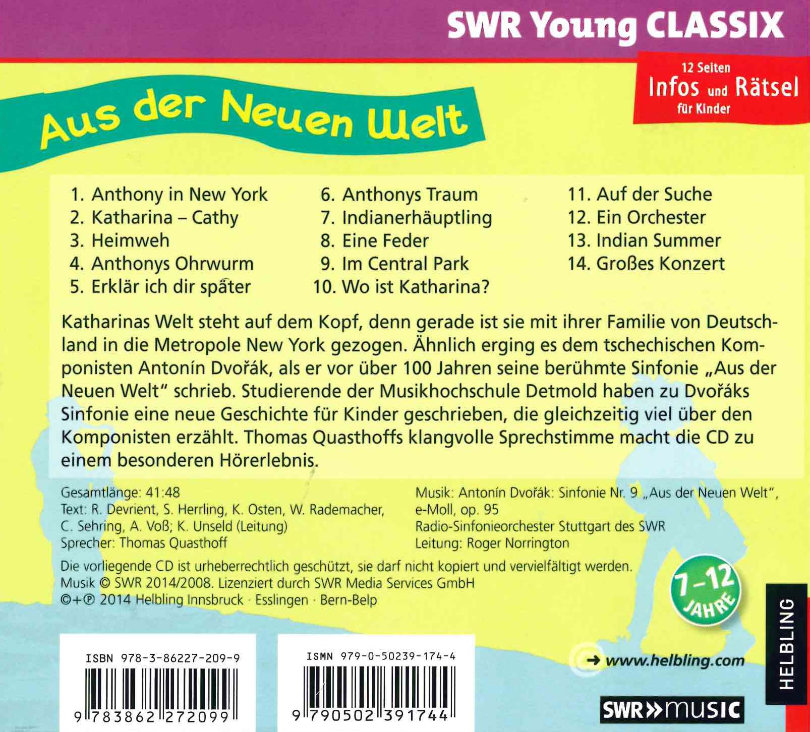 Katharinas Welt steht auf dem Kopf. Gerade ist sie mit ihrer Familie von Deutschland in die Metropole New York gezogen. Alles ist viel größer und ganz anders als in ihrer Heimat. Genauso erging es Antonín Dvorák, als er vor über 100 Jahren seine berühmte Sinfonie "Aus der Neuen Welt" komponierte. Studierende der Musikhochschule Detmold haben nun unter der Leitung von Kerstin Unseld zu dieser Sinfonie eine Geschichte für Kinder geschrieben. Sie handelt von Heimweh und gleichzeitig von der Neugier auf Neues, von Musik aus Amerika und Musik aus Europa, von Dvoráks Zeit und von unserer Zeit. Thomas Quasthoff als Sprecher und das Radio-Sinfonieorchester Stuttgart des SWR unter der Leitung von Roger Norrington machen die Produktion zu einem wahren Hörgenuss. Im beiliegenden Booklet finden Kinder und ihre Eltern Infos und Rätsel zur Hörgeschichte.