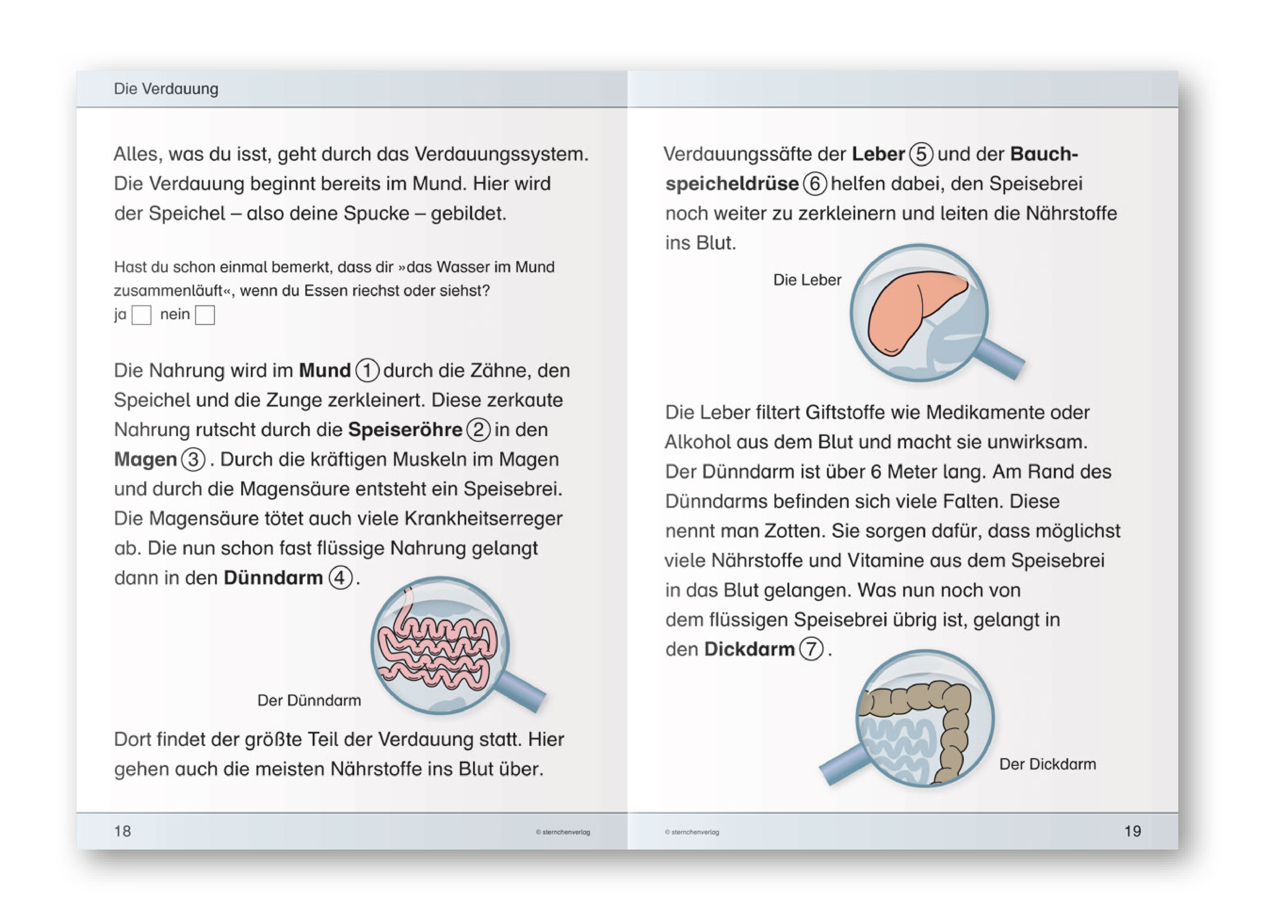 Auch in dieser Reihe erschienen:Ich kenne meinen Körper - Ernährung und Verdauung - ISBN 978-3-939293-36-1Ich kenne meinen Körper - Blutkreislauf und Atmung - ISBN 978-3-939293-35-4Ich kenne meinen Körper - Skelett, Muskeln und Wirbelsäule - ISBN 978-3-939293-34-7