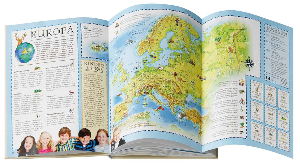 Aufblättern und los geht die spannende, bilderreiche Reise rund um den Globus! Wunderschöne Karten beflügeln die Fantasie und die tollen Zusatzinfos eignen sich hervorragend für Referate in der Grundschule. Auch interessante übergreifende Themen wie das Europaparlament, Weltwunder und Vulkanismus werden dargestellt und erklärt.