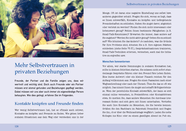 Gehören auch Sie zu den Menschen, die sich oft selbst im Weg stehen, weil sie sich manches nicht zutrauen? Die schon mal unsicher werden, wenn ein Vorstellungsgespräch, ein Vortrag oder ein Kennenlernen ansteht? Machen Sie sich keine Gedanken, denn auch Selbstvertrauen lässt sich lernen! In diesem Buch erfahren Sie, wie Sie durch Auftreten und Körpersprache Ihre Außenwirkung verbessern, wie Sie Ihre Stärken entdecken und wie Sie selbstbewusst mit Ängsten, Fehlern und Misserfolgen umgehen. Ob im Beruf oder im Privatleben - in jeder "kniffligen" Situation helfen Ihnen wertvolle Tipps dabei, souverän aufzutreten und sich nicht aus der Ruhe bringen zu lassen. Erkennen Sie Ihren Selbstwert, verwirklichen Sie Ihre Ziele und besiegen Sie Ihren inneren Kritiker!