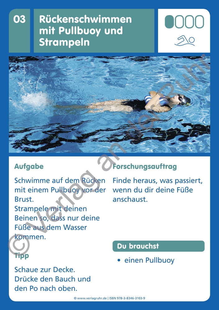 Wasserabweisende Karten mit Schwimmübungen für Grundschule, Förderschule und Schwimmtrainer und -trainerinnen, ab Klasse 1 +++ Sie haben über 20 Kinder in der Klasse und nur 25 Minuten Wasserzeit?Statt am Rand zu sitzen und zuzuschauen, heißt es: Alle zusammen ins Wasser!Unsere Übungs-Kartei ist genau das Richtige für Sie! Statt nacheinander Bahnen zu ziehen und minutenlang auf ihren Einsatz zu warten, können Ihre Schüler und Schülerinnen vielfältigste Übungsformen in Freiarbeit zeitgleich und selbstständig durchführen.Natürlich können die abwechslungsreichen, direkt umsetzbaren Übungen auch abseits der Freiarbeit eingesetzt werden, ganz wie Sie wollen. Forschungsaufträge auf den Karten motivieren Ihre Schüler und Schülerinnen zum Ausprobieren und laden zur Erprobung verschiedener Bewegungsmöglichkeiten im Wasser ein. Dabei lernen die Kinder auch, das eigene Handeln im Wasser zu reflektieren.Durch die Differenzierung in vier Schwierigkeitsgrade werden alle Leistungsstärken berücksichtigt. Ihre Schüler und Schülerinnen können die Karten in Einzelarbeit, Partnerarbeit oder in Kleingruppen nutzen - auch im Stationsbetrieb.