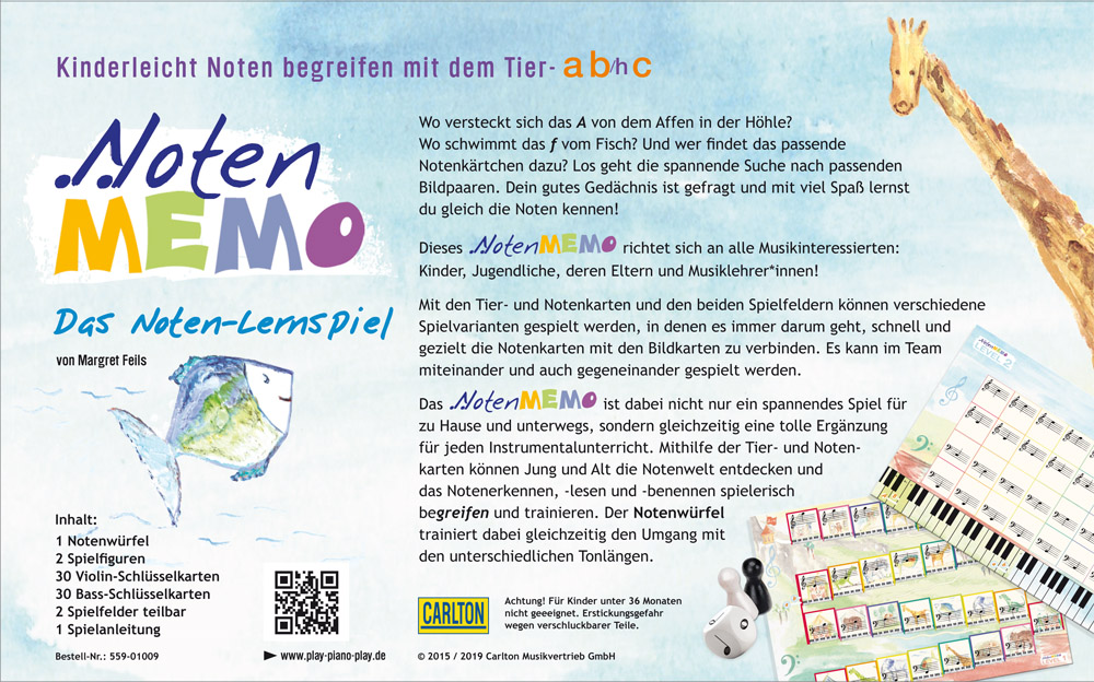 Das Noten-Memo ist dabei nicht nur ein spannendes Spiel für zu Hause und unterwegs, sondern gleichzeitig eine tolle Ergänzung für jeden Instrumentalunterricht. Mithilfe der Tier- und Notenkarten können Jung und Alt die Notenwelt entdecken und das Notenerkennen, -lesen und -benennen spielerisch begreifen und trainieren.