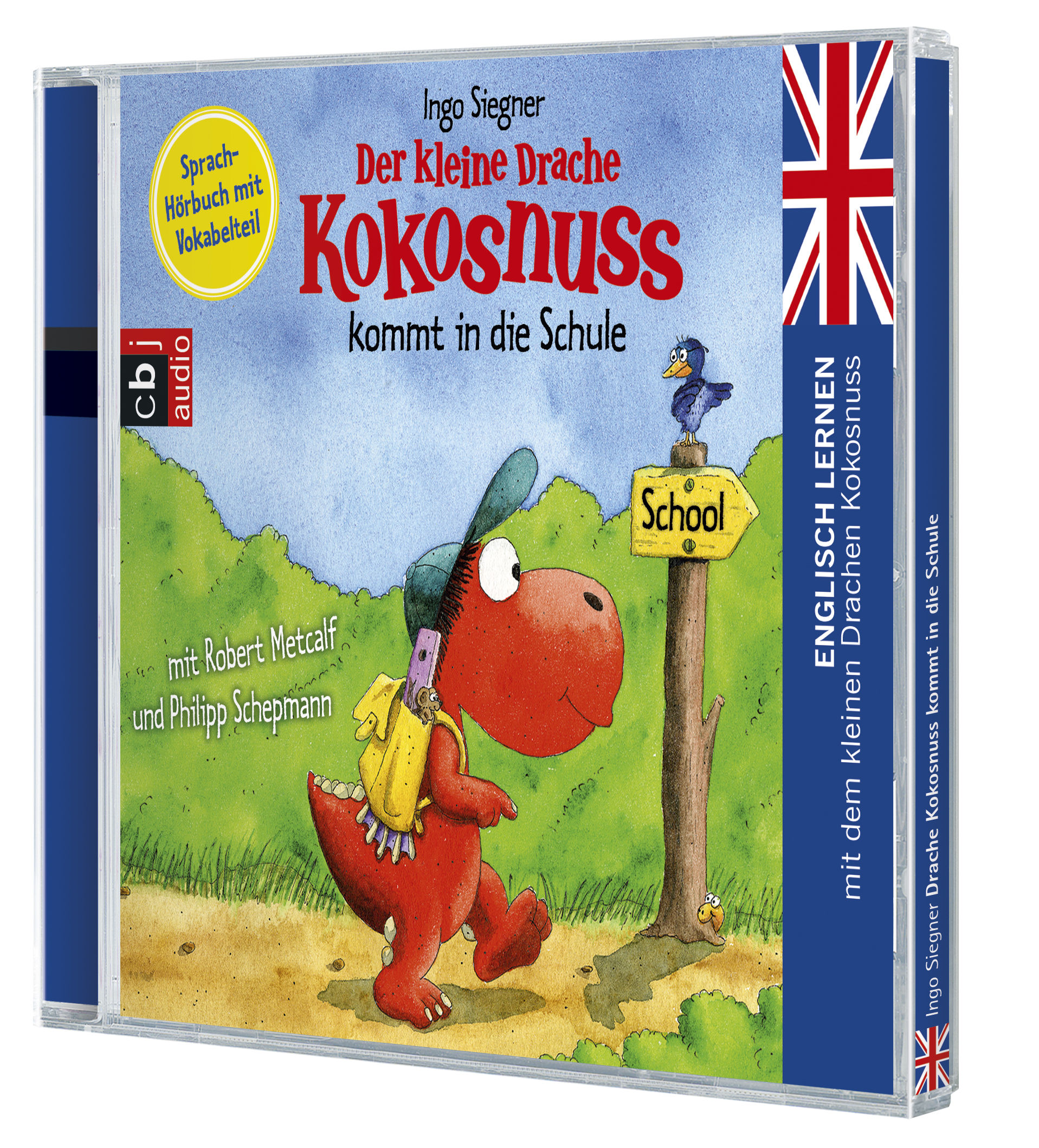 Spielerisches Vokabellernen mit den Abenteuern des kleinen Drachen Kokosnuss: Als der kleine Drache in die Schule kommt, holen seine Eltern Robert Robertson von der Insel Britanica ins Haus, um Kokosnuss beim Englisch lernen zu unterstützen. Basierend auf Ingo Siegners Buch Der kleine Drache Kokosnuss kommt in die Schule vermitteln Native Speaker Robert Metcalf und Kokosnuss-Stimme Philipp Schepmann den jungen Zuhörern einen ersten Einstieg in die englische Sprache.Das Hörbuch erzählt ein spannendes Kokosnuss-Abenteuer, in das drei Sprach-Lektionen und eine Wiederholungslektion eingebettet sind. In jeder Lektion lernen die kleinen Zuhörer mit der Geschichte und einem kurzen Song eine neue Vokabelgruppe kennen. Der Erzähltext ist in Deutsch gesprochen, so dass auch für Englisch-Anfänger keine Verständnisprobleme bestehen. Zum Nach- und Mitlesen finden Kinder und Eltern im bunten Booklet noch einmal alle Vokabeln und Liedtexte abgedruckt. (1 CD, Laufzeit: 1h 3)