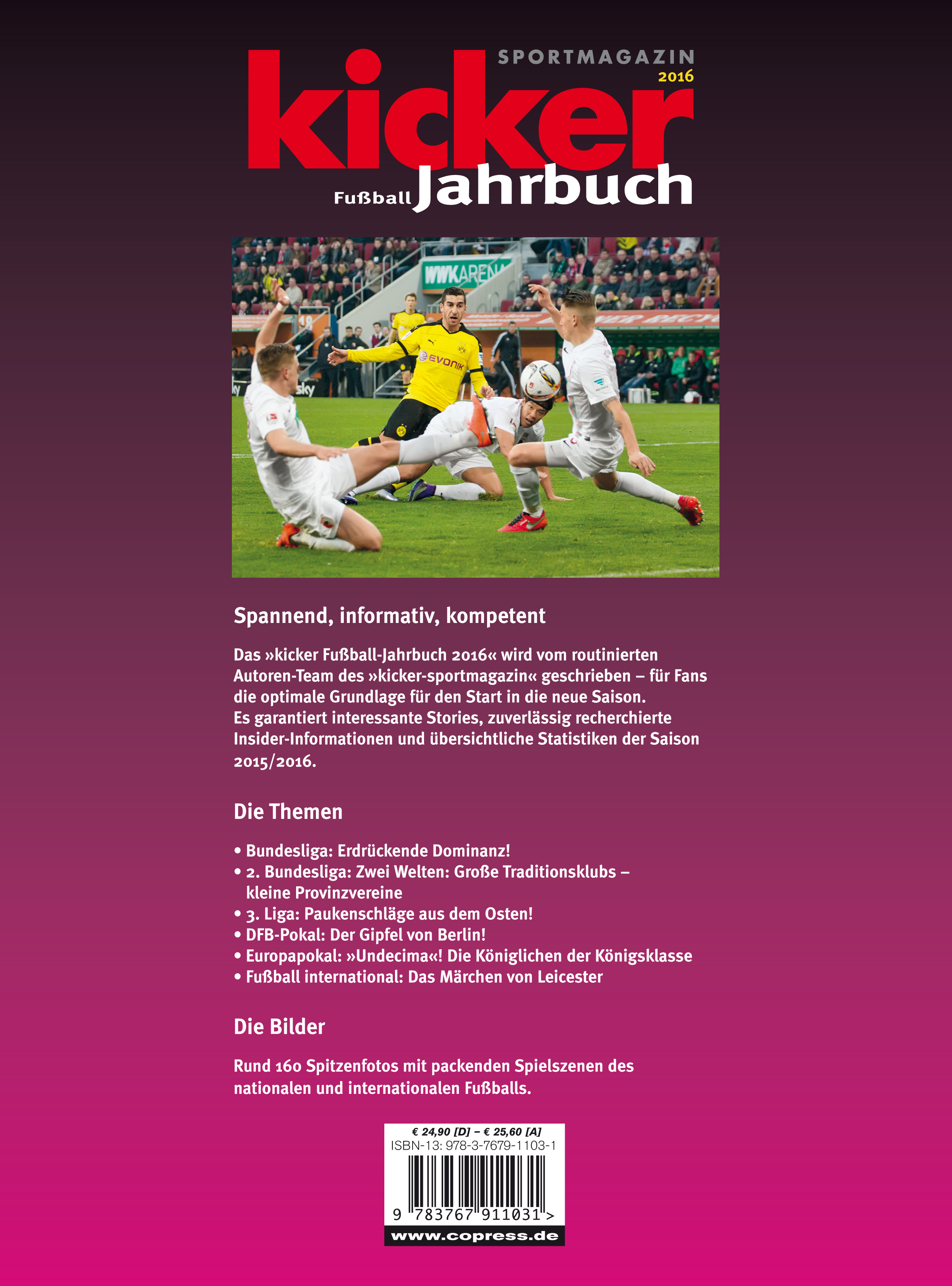 Bereits kurz nach dem letzten Schlusspfiff erscheint das seit Jahrzehnten beliebteste Fußball-Jahrbuch in gewohnt hochwertiger Ausstattung.-> 1. und 2. Bundesliga sowie 3. Liga und Nationalelf-> UEFA-Pokal, Champions League und DFB-Pokal-> Topligen aus England, Spanien, Italien, Österreich, Schweiz-> alle Bundesliga-Spiele und weitere ausführliche Statistiken-> packende Action-Bilder internationaler Top-Fotografen