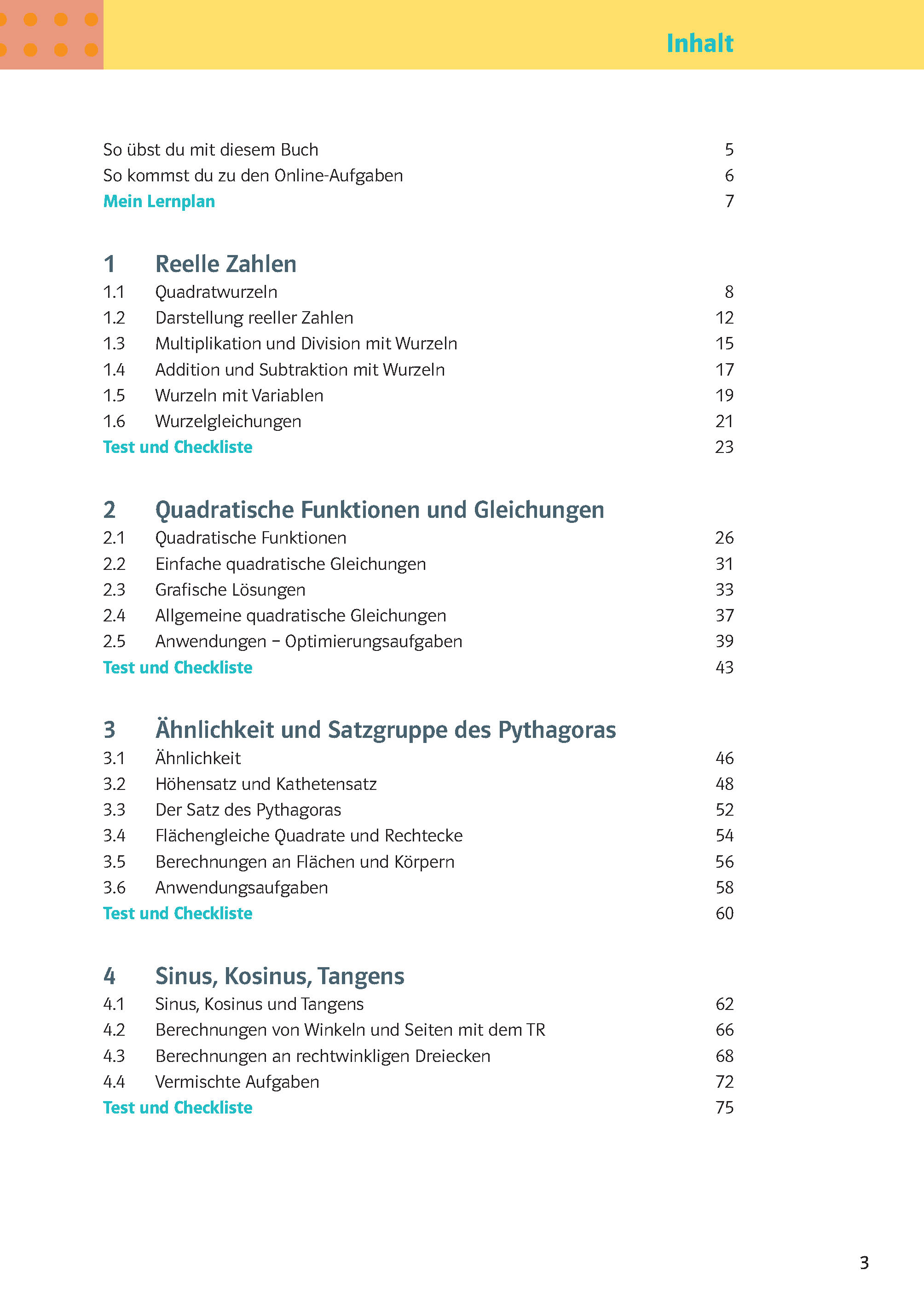 - Mit Übungen zu reellen Zahlen, (quadratischen) Funktionen und Gleichungen, Ähnlichkeit, Satzgruppe des Pythagoras, Potenzen und Potenzfunktionen, Wachstumsvorgänge, Wahrscheinlichkeit, Raumgeometrie, Sinus, Kosinus, Tangens und vieles mehr