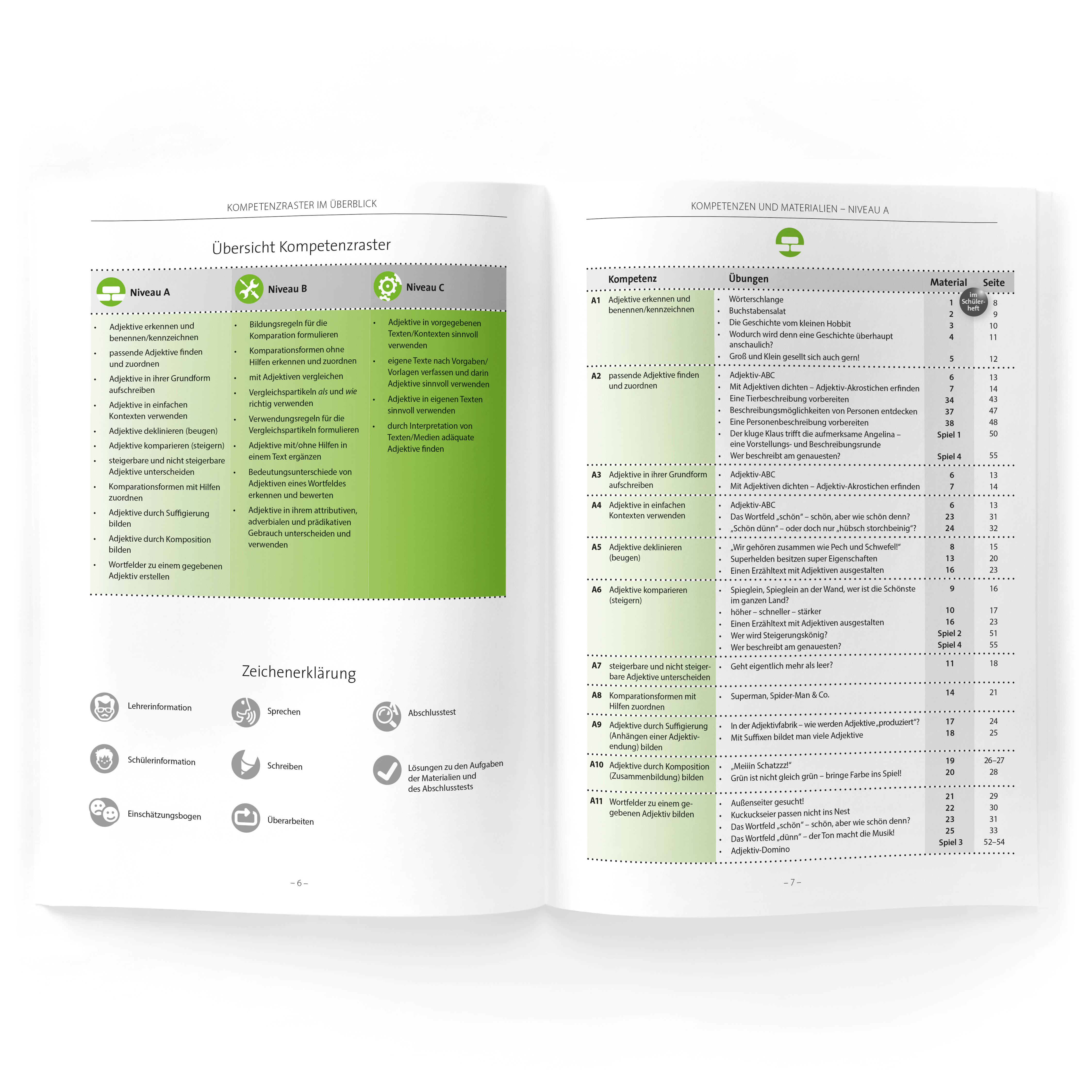 Adjektive Schreiben - Sprache verwenden - Texte gestalten Die Hefte orientieren sich an den KMK-Standards und am mittleren Bildungsniveau der neuen Bildungspläne. Durch drei verschiedene Anforderungsniveaus und Hilfestellungen berücksichtigt es die Situation einer heterogenen Schülerschaft, sodass auch schwächere Schülerinnen und Schüler entsprechend differenziert gefördert werden können. Die Materialien sind vorrangig in den Klassenstufen 5 und 6 der Haupt-, Real- und Gemeinschaftsschule (differenzierte Schulformen) sowie des Gymnasiums einsetzbar. Zusätzlich kann das Material ebenso zur Vertiefung und Wiederholung in der Klassenstufe 7 verwendet werden. Die angestrebten Kompetenzen werden binnendifferenziert entwickelt. Ein Raster im Lehrerheft listet den Kompetenzbezug der Materialien und deren Anforderungsniveau auf und gibt Orientierung und Hinweise für die Aufgaben des Schülerhefts. Der Lösungsteil zu allen Aufgaben, der Abschlusstest mit Lösungsbögen kann auch in Form von Kopien (oder digital) für offene und individuelle Schülerarbeitsformen verwendet werden. Intentionen Die Vermittlung und das Festigen eines Grundwissens zur Wortart Adjektiv. Die Schülerinnen und Schüler lernen die Wortart kennen, was die Grundregeln der Deklination und Komparation sowie die Funktion und den Gebrauch von Adjektiven einschließt. Ebenso wird diese Wortart in Verwendungszusammenhängen (z. B. in narrativen und lyrischen Texten) untersucht, was zu einer Verknüpfung mit der Kompetenz Lesen - mit Texten und Medien umgehen führt. Die Vernetzung mit den Kompetenzbereichen Schreiben und auch Sprechen erfolgt durch unterschiedliche Schreibanlässe. Der Funktion des Adjektivs - einem Lebewesen, Gegenstand, einer Handlung oder einem Zustand bestimmte Eigenschaften beziehungsweise Merkmale zuzuschreiben - wird durch die Verknüpfung mit den Aufsatzformen Beschreibung und Erzählung Rechnung getragen. Dazu enthält das Heft schülergemäße Schreib-, Spiel- und Sprechanlässe. Eine individuelle Förderung der Schülerinnen und Schüler wird durch die binnendifferenzierte und kompetenzorientierte Gestaltung des Unterrichtsmaterials ermöglicht. Aufgrund der Vielfältigkeit und der Vielzahl der Arbeitsblätter zu den unterschiedlichen Kompetenzen und Anforderungsniveaus können die Materialien auch in Lernzirkeln oder Lerntheken, als Wochenplan organsiert, im Förderunterricht, zum eigenständigen Üben oder zum Wiederholen und Festigen eingesetzt werden. Das Lehrerheft Auflistung des Kompetenzbezugs der Materialien und deren Anforderungsniveau, didaktisch-methodische Hinweise, Lösungen zu allen Aufgaben des Schülerhefts, umfangreicher Abschlusstest mit Lösungsbögen, Fremdeinschätzungsbogen für Feedback