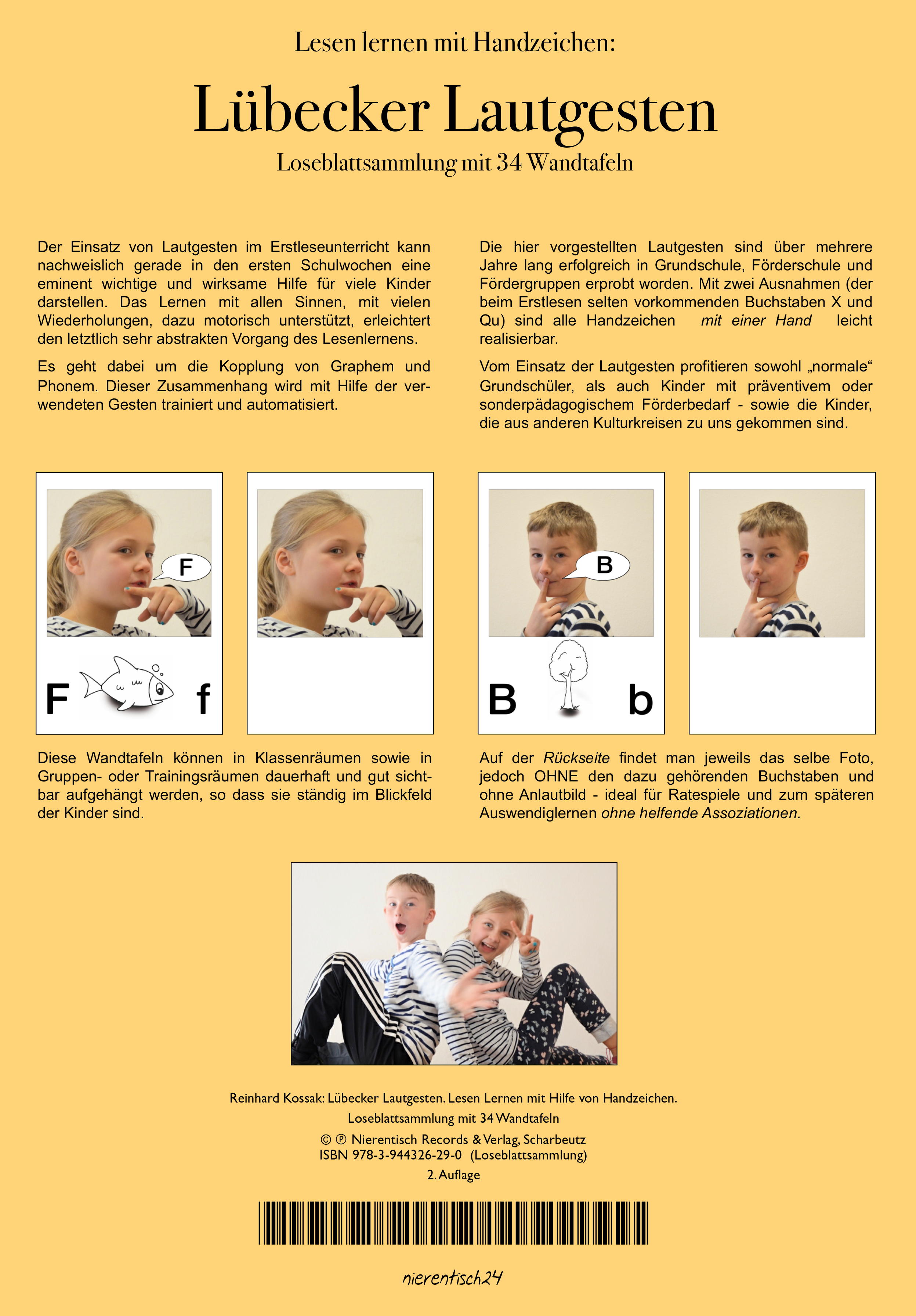 34 Wandtafeln mit Lautgesten. Dazu je ein A1-Plakat mit allen Anlautbildern in Druckschrift und in Schreibschrift sowie ein A1-Plakat mit allen Lautgesten. Die neue überarbeitete zweite Auflage jetzt mit Handzeichen, die sich mit einer hand realisieren lassen - ein Wunsch vieler Lehrkräfte.Der Einsatz von Lautgesten (Lautgebärden, Handzeichen, Geheimzeichen ...) im Erstleseunterricht kann nachweislich gerade in den ersten Schulwochen eine eminent wichtige und wirksame Hilfe für viele Kinder darstellen. Das Lernen mit allen Sinnen, motorisch unterstützt, erleichtert den letztlich sehr abstrakten Vorgang des Lesenlernens. Es geht dabei um die Kopplung von Graphem und Phonem. Dieser Zusammenhang wird mit Hilfe der verwendeten Gesten trainiert und automatisiert. Die hier vorgestellten Lautgesten sind über mehrere Jahre lang erfolgreich in Grundschule, Förderschule und diversen Fördergruppen erprobt worden. Letztlich profitieren davon sowohl "normale" Grundschüler, als auch Kinder mit präventivem oder sonderpädagogischem Förderbedarf - sowie Kinder mit Migrationshintergrund.Jede dieser 34 Wandtafeln zeigt die jeweilige Lautgeste anhand klarer, eindeutiger Fotos, ergänzt durch kindgerechte Abbildungen, die gut zum Anlaut eine gut zu merkende Assoziation weckt. Die Tafeln können in Klassenräumen sowie in Gruppen- oder Trainingsräumen dauerhaft und gut sichtbar aufgehängt werden, so dass sie ständig im Blickfeld der Kinder sind. Auf der Rückseite findet man jeweils das selbe Foto, jedoch OHNE den dazu gehörenden Buchstaben und ohne Anlautbild - ideal für Ratespiele und zum späteren Auswendiglernen ohne helfende Assoziationen.Selbstverständlich gibt es auch eine Übersichtstafel für Lehrkräfte und zusätzlich noch eine kurze verbale Beschreibung für jede einzelne Lautgeste.Dazu die drei A1-Plakate mit allen Anlauten und allen Lautgesten - eine sinnvolle Ergänzung. Ideal zur Ausstattung von Klassen- Gruppen- und Therapieräumen. Sehr beliebt auch zur Wanddekoration in Kinderzimmern!