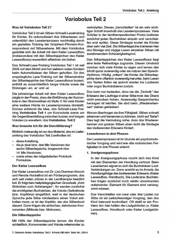 Das Silben-Schnell-Lesetraining automatisiert das Silbenlesen und unterstützt den Leselernprozess nachhaltig durch ein gezieltes Training der Graphem-Phonem-Korrespondenz.Die Einführung der Kurzvokale in den Stammsilben stellt für viele Kinder eine Hürde im Leselernprozess dar.Das Lesetraining steigert die Benenngeschwindigkeit. Auch Kinder, die bereits alle Buchstaben kennen, können das schnelle Lesen trainieren.Das Training steigert die phonologische (lautgetreue) Lesegeschwindigkeit und automatisiert den Lesevorgang auf Silbenebene.Das Schnell-Lese-Training Variabolus Teil 1 ist seit 2006 auf dem Markt und hat seitdem vielen Kindern beim Automatisieren der Silben geholfen. Es basiert auf der Silbenstruktur der Silbenteppiche des Kieler Leseaufbaus und enthält es ausschließlich lange Vokale sowie die Endungen -en, -er und -el.Variabolus 2 erweitert die Silbenmixe um Kurzvokale sowie um die Gegenüberstellungen zwischen kurzen und langen Vokalen.Die thematischen Schwerpunkte der 14 Silbenmixe:- lange Vokale sowie Endsilben -en, -er, -el- kurze Vokale in der Stammsilbe (z.B. ren, nen)- Gegenüberstellung kurzer und langer Vokale- Stammsilben mit Kurzvokal auf -an, -en, -in, -on, -un, -ar, -er, -ir, -or, -ur- Stammsilben mit Kurzvokal auf -al, -el, -il, -ol, -ul, -ak, -ek, -ik, -ok, -uk- Stammsilben mit Kurzvokal auf -at, -et, -it, -ot, -ut, -am, -em, -im, -om, -um- Silbenteppiche mit anderen DurchmischungenDiese Art des Lesens ist anstrengend. Darum sollten die Ergebnisse den Kindern immer sofort zurückgemeldet werden. Ein schnelles positives Feedback motiviert die Kinder stark.Die anschauliche Leistungskurve im Diagramm der beiliegenden Protokollbögen zeigen dem Kind seine Fortschritte. Der sichtbare Erfolg spornt sie an und sie gewinnen ihre Freude am Lesen zurück.Das Silben-Schnell-Lesetraining enthält eine ausführliche Anleitung und 25 Protokollbögen.Es kann separat (optimalerweise nach Beendigung des Variabolus Teil 1) oder ergänzend zum Kieler Leseaufbau (ab Stufe 11), bzw. zum Kieler Rechtschreibaufbau eingesetzt werden.Für das Material besteht Kopierverbot.