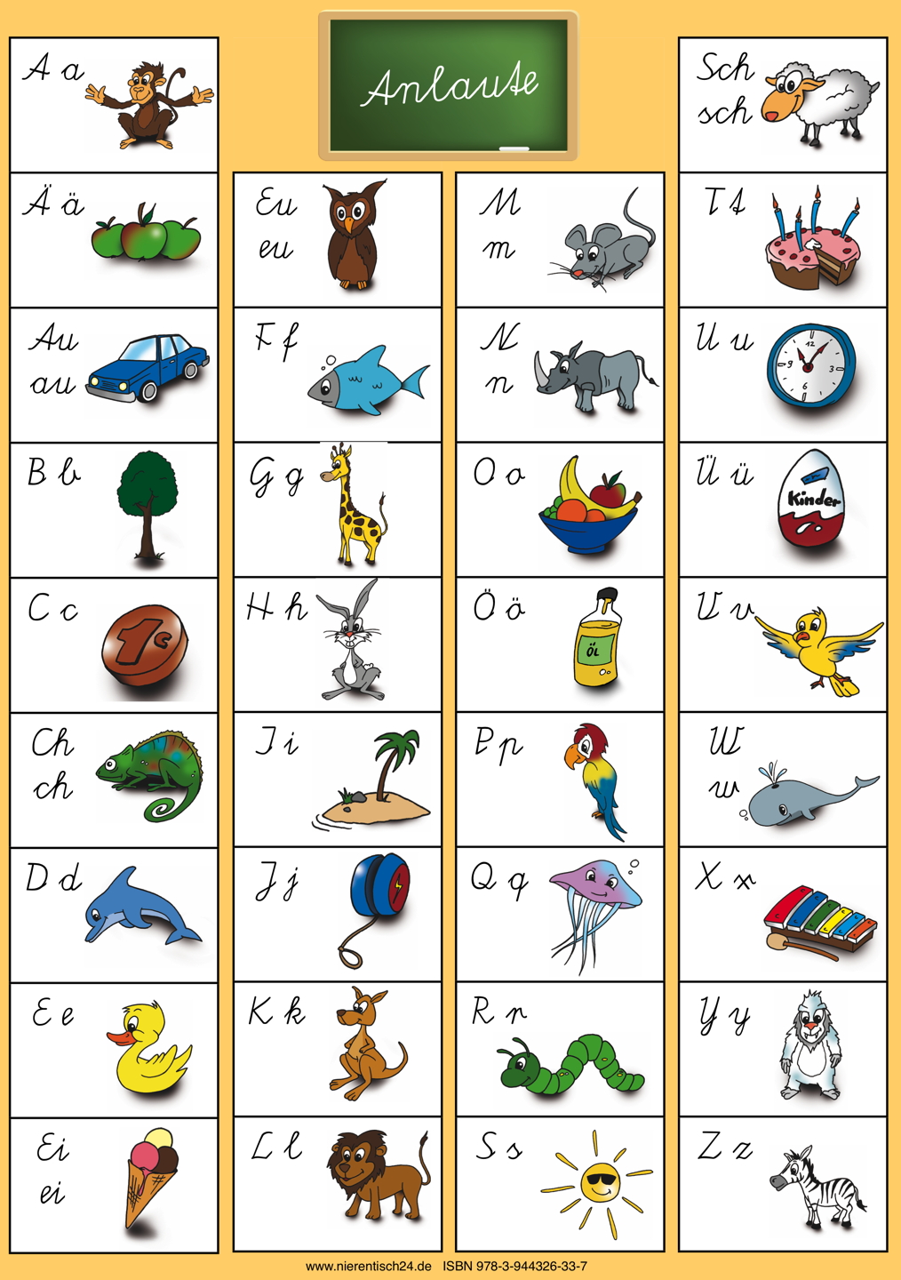 Durch den bewussten und spielerischen Umgang mit den Anlauten lernen Kinder das Prinzip der Laut-Buchstaben-Zuordnung, die Zerlegung eines Wortes in seine Lautbestandteile und die lauttreue Verschriftung. Die Kinder erschließen sich so die Schrift und letztlich auch das Schreiben und Lesen. Mit Hilfe dieser Tischkarten hat das Kind den Zusammenhang zwischen (An-)laut und Buchstabe stets vor Augen. Je nach dem jeweiligen Lernstand wird entweder die Druckschrift- oder die Schreibschrift-Variante auf den Arbeitsplatz gelegt.