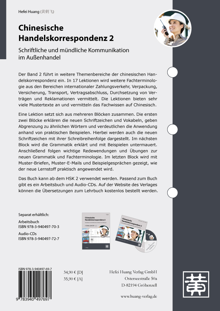 Der Band 2 führt in weitere Themenbereiche der chinesischen Handelskorrespondenz ein. In 17 Lektionen wird weitere Fachterminologie aus den Bereichen internationaler Zahlungsverkehr, Verpackung, Versicherung, Transport, Vertragsabschluss, Durchsetzung von Verträgen und Reklamationen vermittelt. Die Lektionen bieten sehr viele Mustertexte an und vermitteln das Fachwissen auf Chinesisch.
