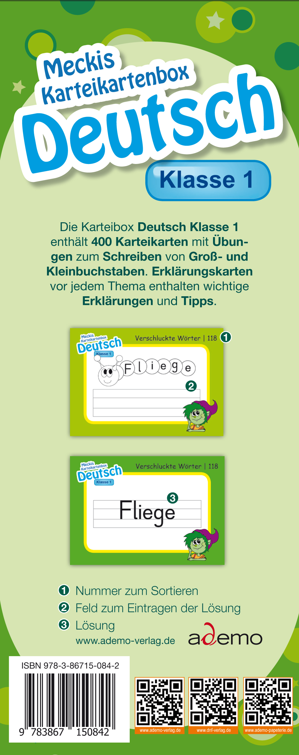 Die Karteibox Deutsch Klasse 1 enthält 400 farbige Karteikarten mit tollen Spielen zum Schreiben von Groß und Kleinbuchstaben. Jetzt neu mit lustigen Mecki-Stickern.
