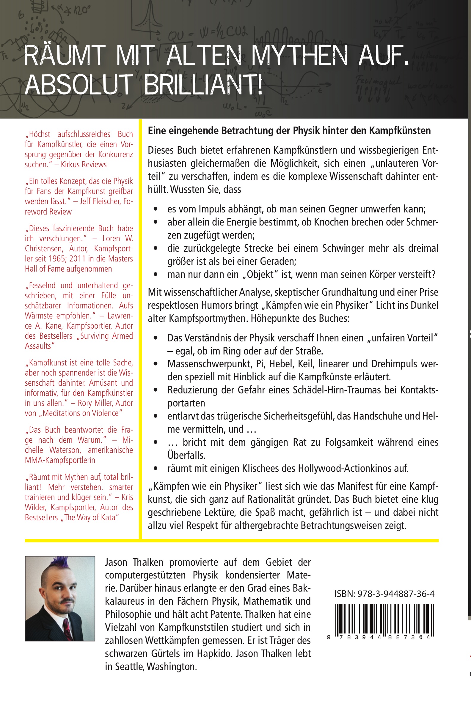 Jason Thalken promovierte an derUniversity of Southern Californiazum Doktor der computergestützten Physik kondensierter Materie; zudem erlangte er an der University of Texas den Grad eines Bachelors in Physik, Mathematik und Philosophie. Jason hat acht Patente im Bereich der Datenwissenschaft und-modellierung für den Finanzdienstleistungssektor angemeldet, dazu ein weiteres für den Schutz vor traumatischen Hirnverletzungen in Sportarten wie Boxen, MMA und Football. Seit 1995 hat Jason zahlreicheKampfkünste erlernt und viele Wettkämpfe bestritten. Im Hapkido erlangte er bei Großmeister Ho Jin Song den schwarzen Gürtel. In den Wäldern von Massachusetts aufgewachsen, entwickelte Jason schon frühzeitig eine Liebe zur natürlichen Welt und wusste bereits im Alter von sieben Jahren, dass er eines Tages Wissenschaftler werden würde. Nach seinem Umzug in einen Vorort von Dallas begann er, Taekwondo-Unterricht zu nehmen und verliebte sich bei seinem allerersten Wettkampf, in dessen Verlauf er sich seinen Fuß brach, in den chaotischen und komplexen Charakter realer Kämpfe. Einmal, während seines Grundstudiums an der University ofTexas, wollte Jason mit dem dortigen Judoteam zum Wettkampf antreten. Doch beim offiziellen Wiegen brachte er ein halbes Pfund zu viel auf die Waage. Man sagte ihm, er solle es in einer Stunde noch einmal versuchen. Daraufhin zogen sich sämtliche Mitglieder des Judoteams der UT bis auf ihre Unterwäsche aus und gaben ihre Sachen Jason, der sie allesamt überzog. Von seinen Teamkollegen angefeuert, lief er endlose Runden um einen Parkplatz und machte unzählige Wiederholungen des Hampelmanns. In einem dicken Kokon aus T-Shirts und Trainingshosen steckend, dass ihm der Schweiß lief und er sich nur mit Mühe bewegen konnte, spuckte er zudem, durch Kaugummikauen befördert, unaufhörlich aus. Nachdem auf diese Weise eine Stunde verstrichen war, hatte Jason – dank der Unterstützung seiner halbnackten Freunde – ein halbes Pfund Körpergewicht in Form von Schweiß und Spucke verloren. Die letzten anderthalb Jahrzehnte hat Jason in Austin, Los Angeles und New York verbracht. Derzeit lebt er mit seiner Familie in Seattle im Bundesstaat Washington.