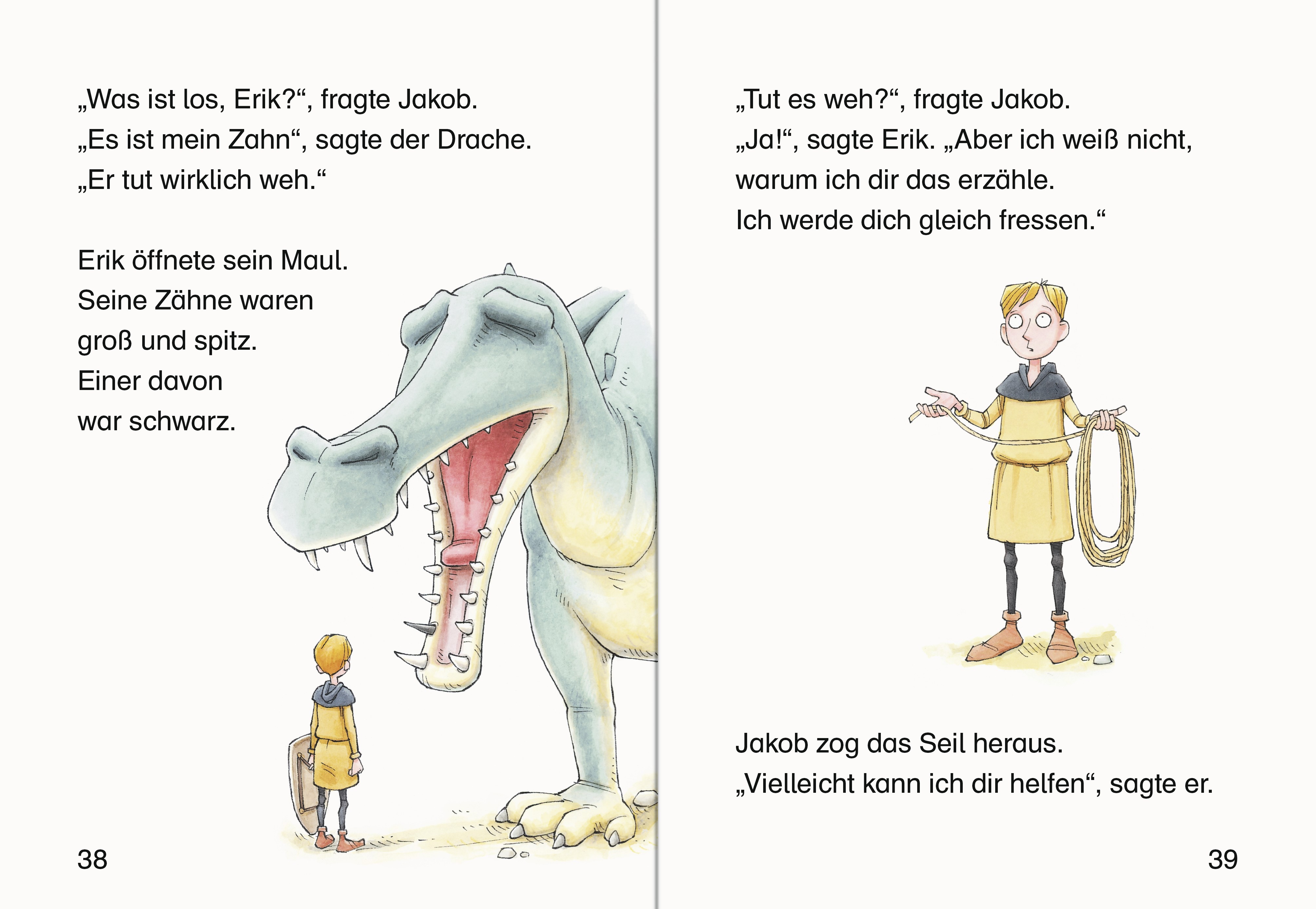 In Jakobs Familie sind alle Ritter - sogar seine Schwester. Nur Jakob selbst ist noch nicht einmal Knappe. Um allen zu beweisen, wie mutig er ist, beschließt Jakob, einen Drachen zu fangen. Wie gut, dass er dem Drachen Erik einen Zahn zieht und ihn so von dessen Zahnschmerzen befreit. Der Drache ist so erleichtert, dass er mit Jakob zum Schloss fliegt ...