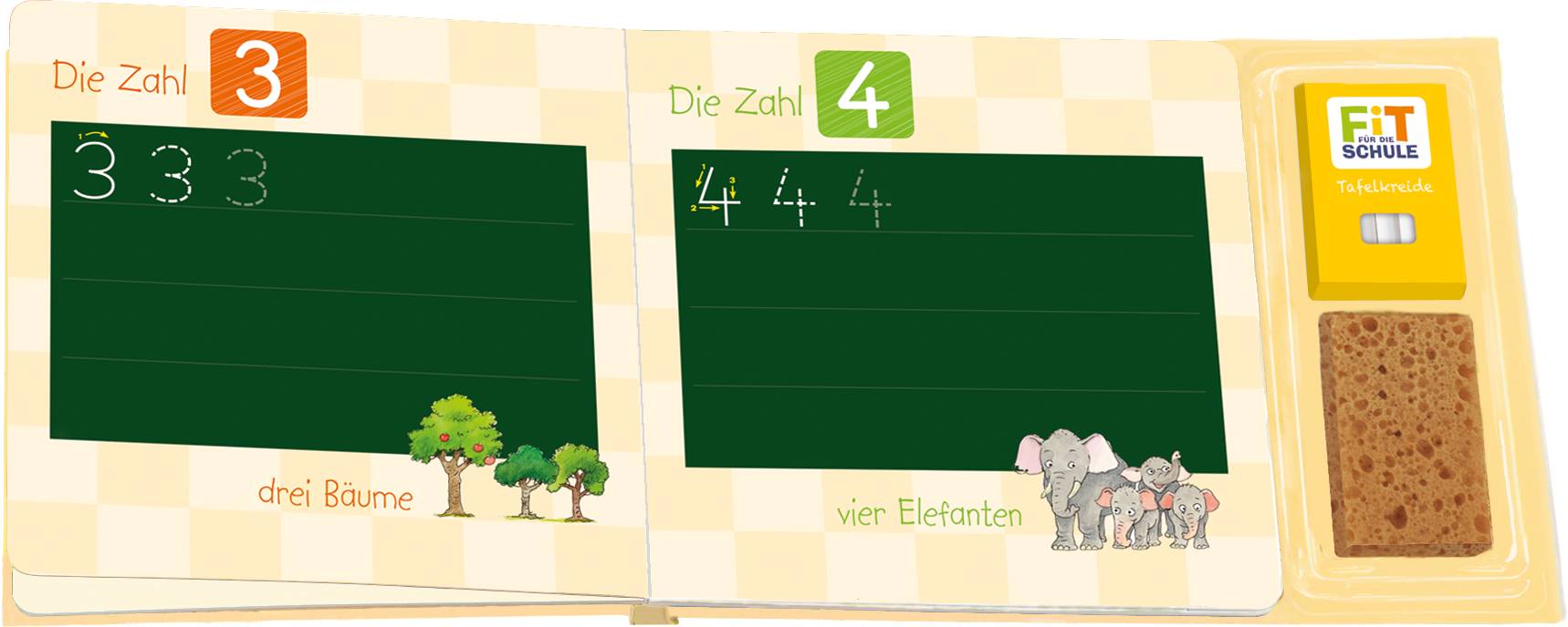 Mit diesem Tafelbuch lernst du im Handumdrehen die Zahlen von 1 bis 10. Nimm eine Kreide, folge den Pfeilen und schreibe die Zahlen nach. Mit dem Schwamm wischst du die Tafelflächen einfach wieder ab. So kannst du üben, sooft du möchtest: ein Haus, zwei Dinosaurier, drei Bäume ...