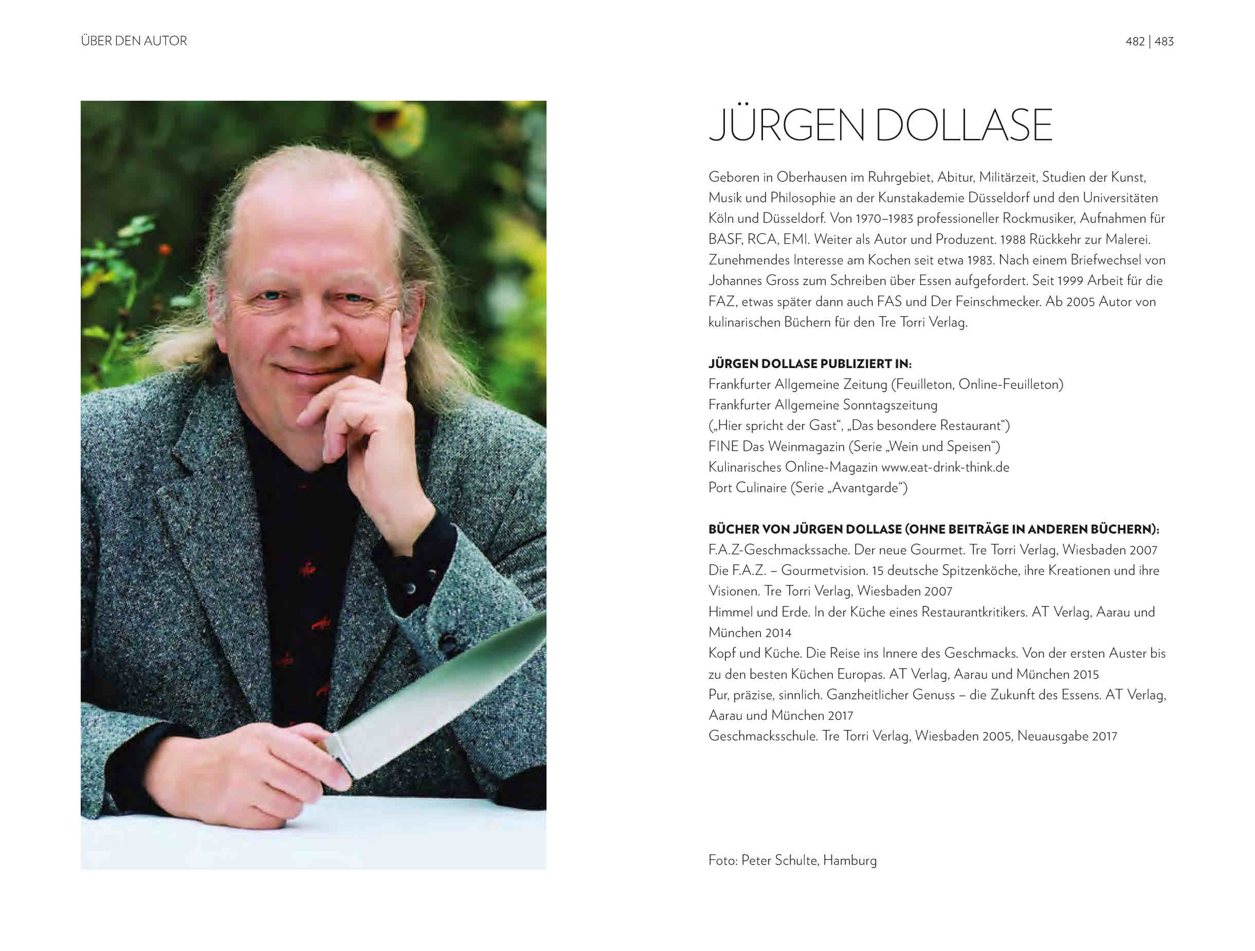Seit der bekannte Restaurantkritiker vor bald 30 Jahren in Paris (wo sonst?) den Genuss kulinarischer Köstlichkeiten und damit seine wahre Berufung entdeckte, arbeitet er unermüdlich daran, das kulinarische Bewusstsein seiner Mitmenschen zu erweitern. Als ehemaliger Rockmusiker, der zudem in jüngeren Jahren die schönen Künste (ja, auch Philosophie!) studierte und malte, zeigt er sich nicht grundsätzlich dem „Fast Food“ abgeneigt – allerdings nur, wenn es denn ordentlicher Qualität ist. Der gebürtige Oberhausener schreibt seit 1999 für die FAZ; seine Artikel und Kolumnen finden sich darüber hinaus in der Frankfurter Allgemeinen Sonntagszeitung sowie im Magazin Der Feinschmecker, und er ist Autor zahlreicher Bücher. Im TRE TORRI Verlag erscheinen Jürgen Dollases Standardwerke der Kulinarik seit 2005.