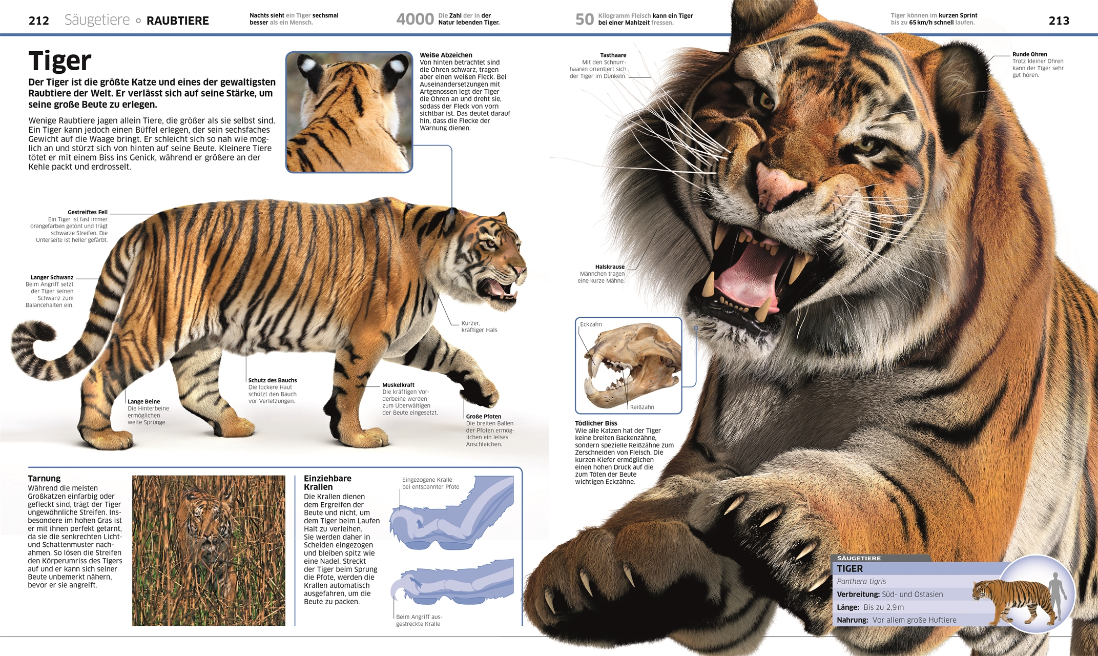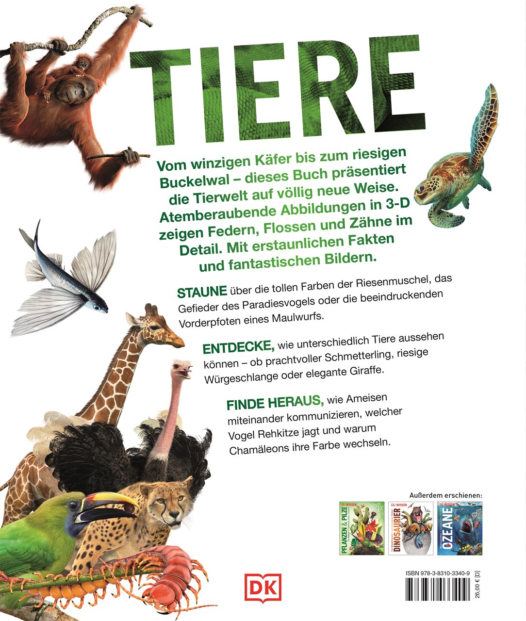Zahlreiche spektakuläre Fotografien, Illustrationen und 3D-Grafiken zeigen euch große Tiergruppen wie Vögel, Säugetiere, Reptilien oder Fische in all ihren vielfältigen Facetten. Erlebt die langen Tentakel der pazifischen Kompassqualle, die bunte Federpracht des Raggi-Paradiesvogels oder die mächtige Mähne des Löwen - lebensecht und hautnah!