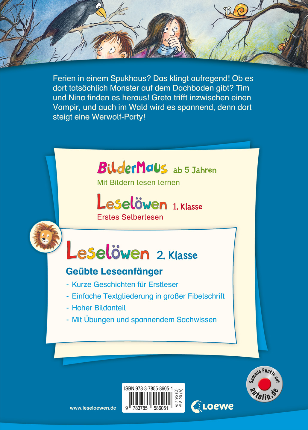 Ferien in einem Spukhaus? Das klingt aufregend! Ob es dort tatsächlich Monster auf dem Dachboden gibt? Tim und Nina finden es heraus! Greta trifft inzwischen einen echten Vampir, und auch im Wald wird es spannend, denn dort steigt eine Werwolf-Party!