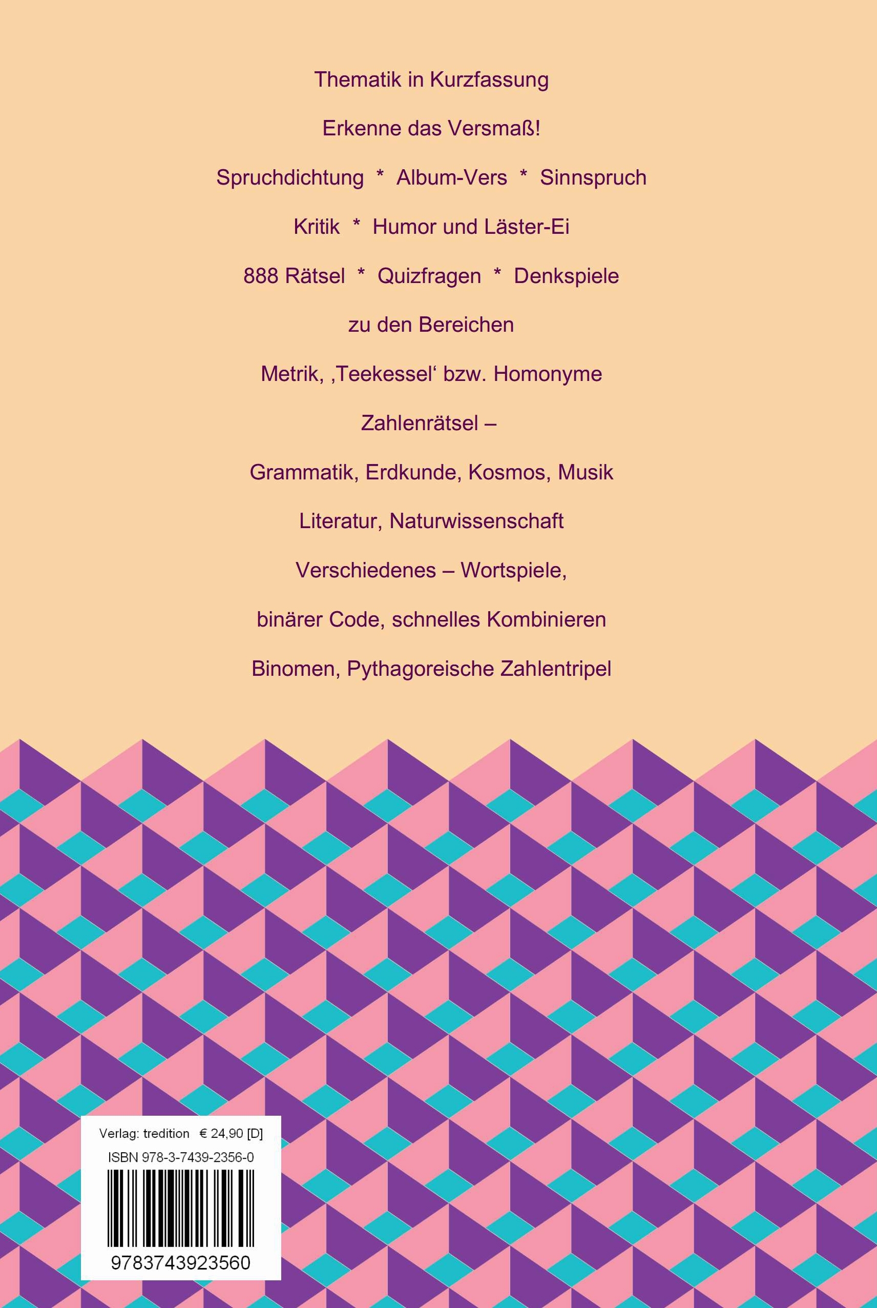 | Schlagworte | Belletristik: allgemein und literarisch • binärer Code • Binomen • Denken • Denkspiele • Erdkunde • Geschenkbuch • Grammatik • Hirnjogging • Homonyme • Humor • Knobeln • Kosmos • Kritik • Läster-Ei • leverkuehn • Literatur • Mathematik • Metrik • Musik • Naturwissenschaft • Pythagoreische Zahlentripel • Quiz • Quizfragen • Rätsel • Rätsel • schnelles Kombinieren • Sinnspruch • Spruchdichtung • Teekessel • Tüfteln • Undine • Verse • Witz • Wortspiele • Zahlenrätsel |