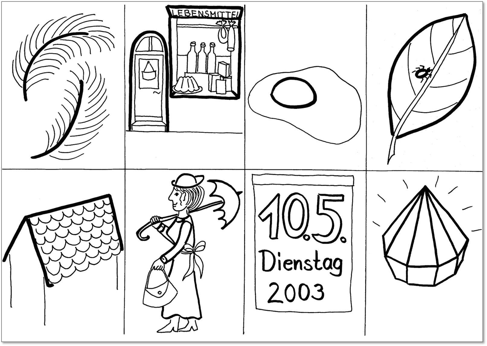 Die Bildkarten bestehen aus ca. 600 Einzelbildern im Format A7. Dargestellt sind hauptsächlich Substantive (z. B. „Palme“, „Fuß“, „Datum“), einige Verben (z. B. „malen“, „schieben“) und wenige Adjektive (z. B. „nass“, „treu“). Jede Bildkarte ist nur mit einem Begriff belegt, um bei den Schülern eine Verwirrung bei der Begriffszuordnung zu vermeiden. Trotzdem eignet sie sich mehrfach zum Einsatz, z. B. „Fuß“: