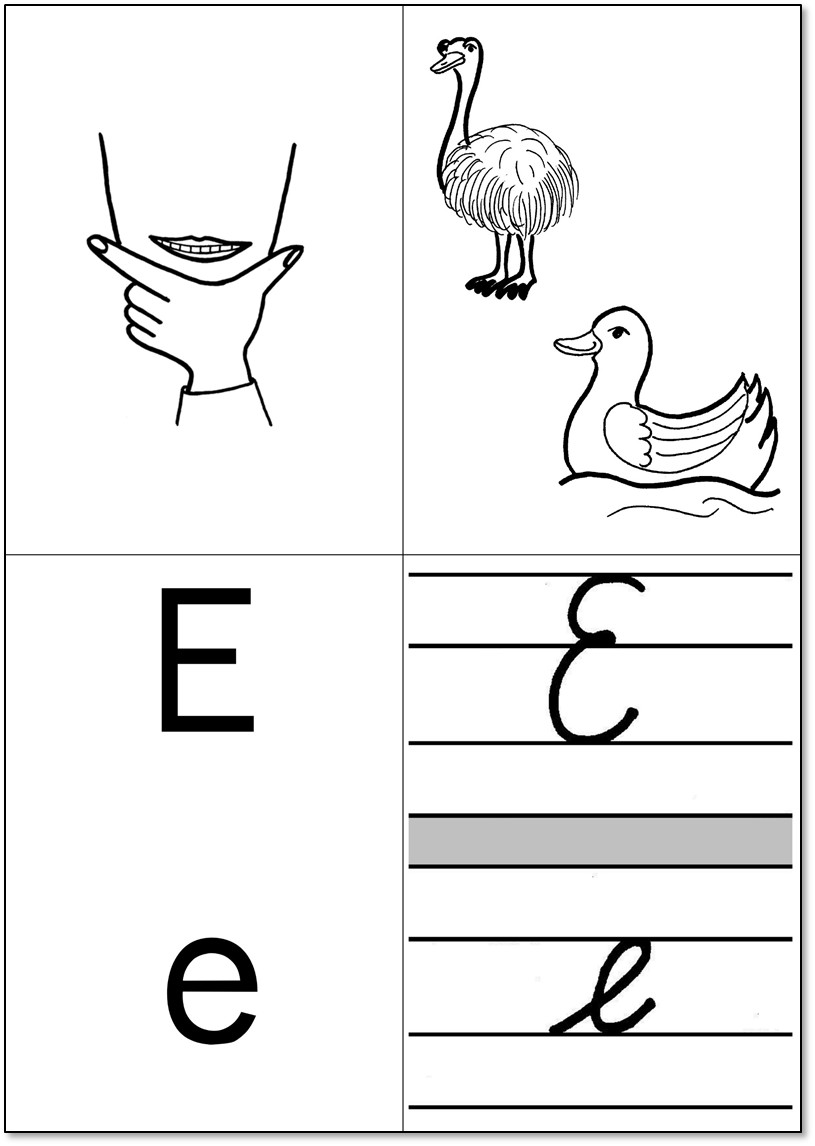 Auf 38 DIN-A4-Karten sind alle Buchstaben des Alphabetes sowie /sch/ch/ als Einzellaut und die Endungen /-en/-er/-el/ als Einheit dargestellt.