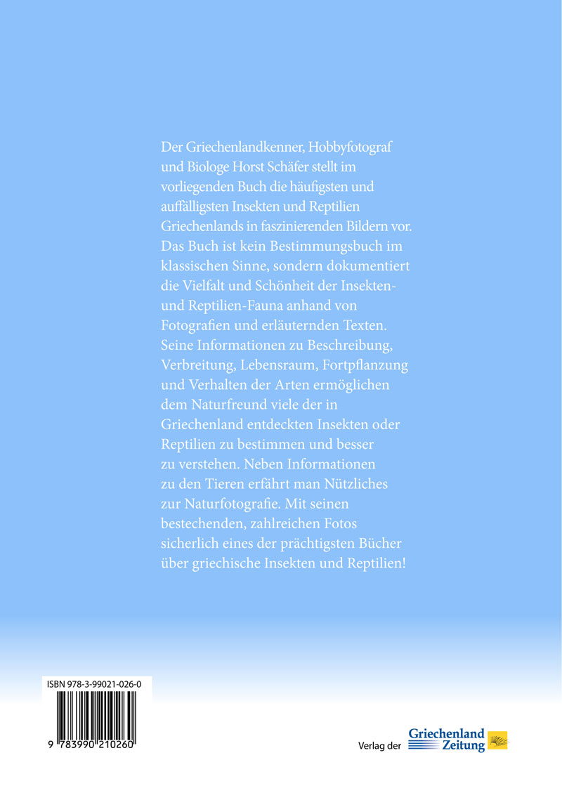 Griechenland mit seinen gastfreundlichen Menschen, seiner Wärme, dem Licht und den Farben und besonders mit seiner Natur ist für den Autor zu seiner zweiten Heimat geworden. Er zeigt uns, dass man sich - auch im Urlaub - die reiche und einzigartige Tierwelt dieses Landes auf umweltverträgliche Art und Weise erschließen kann. Die zahlreichen Fotos in diesem Buch sollen das Interesse und vielleicht sogar die Begeisterung für diese Tiere wecken. Im Kapitel "Insekten", denen man in Griechenland auf Schritt und Tritt begegnet, demonstriert Schäfer die Mannigfaltigkeit der Formen und Farben dieser Spezies. In seinen Texten und Fotos bringt er dem Leser anschaulich die farbenprächtigen oder ausgefallenen Formen näher ebenso wie die lauten Zikaden mit ihrer durchdringenden Musik. Der Autor stellt bei den Schmetterlingen etwa den Großen und Kleinen Fuchs oder den Schwarzblauen Eisvogel vor, dann wieder die Holz- und Pelzbienen, die Libellen, Heuschrecken, Zikaden, Käfer und die Reptilien Zu letzteren gehören nicht nur die "Herrscher der Inseln", die Schlangen, sondern auch Echsen und Schildkröten. Unterhaltsam aufgelockert wird der lehrreiche Ratgeber mit Gedichten und Prosatexten - etwa von Leonardo da Vinci - zu den behandelten Tieren. Schließlich runden das Buch Texte über die Rolle der Biene im Altertum oder Ratschläge wie "Was tun bei einem Schlangenbiss?" ab. Am Ende stehen nützliche Tipps zum Fotografieren der Tiere, was u. a. wegen des Fluchtinstinkts gar nicht so einfach ist.Dieses Buch mit dem Titel "Die auffälligsten Insekten und Reptilien Griechenlands" ist wie eine farbenfrohe und detaillierte Reise in die faszinierende Natur dieses Mittelmeerlandes.