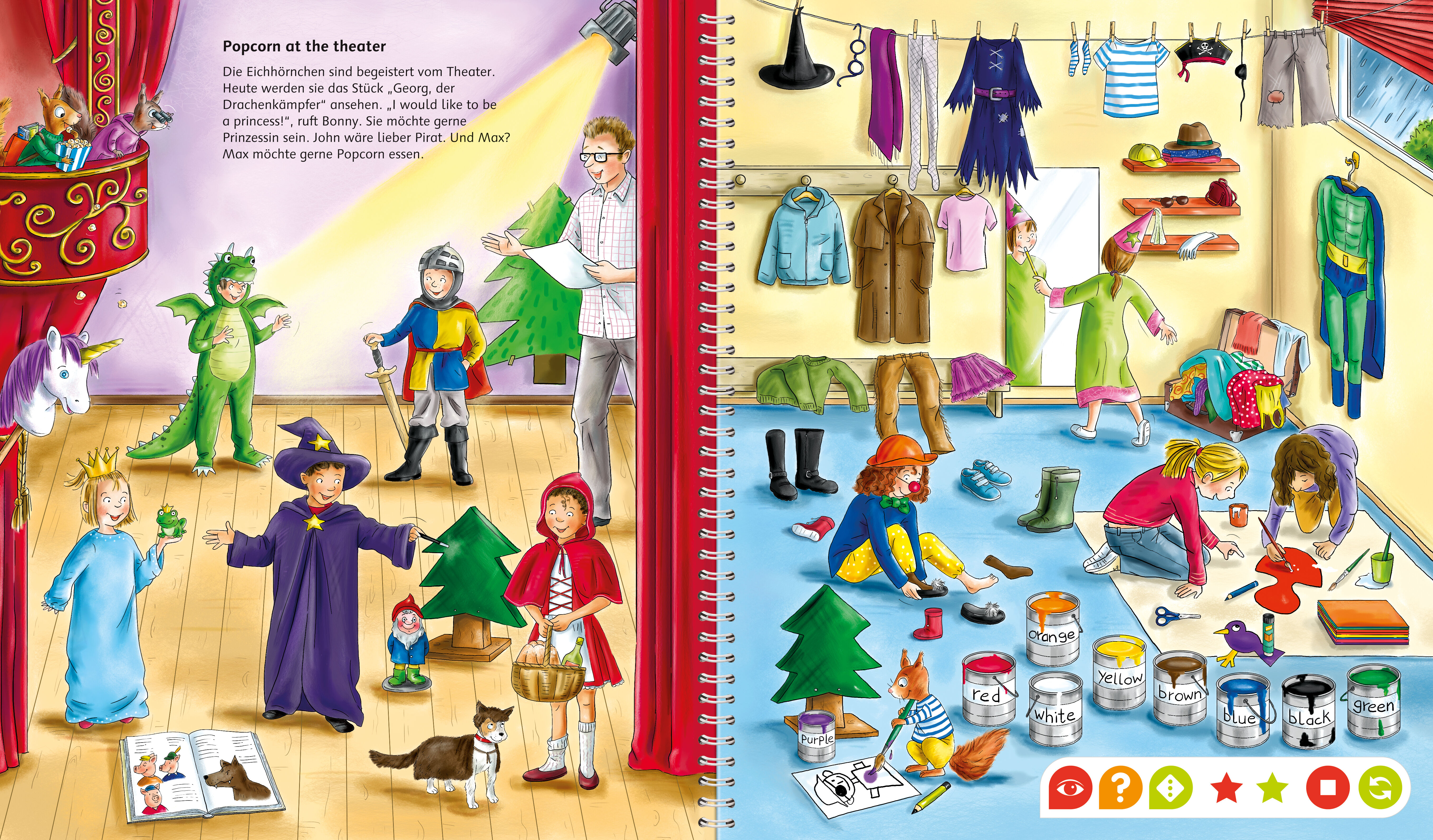 Eichhörnchen Max besucht seine Verwandten Bonny und John in London. Gemeinsam erleben die drei einen aufregenden Tag: Sie kaufen Nüsse auf dem Markt, feiern Opas Geburtstag und sehen sich ein Theaterstück an. Ganz spielerisch lernen Kinder mit diesem Band erste englische Sätze. Der umfangreiche Wortschatz deckt fast alle Bereiche ihres Alltags ab: Familie, Fahrzeuge, Tiere, Zahlen, Farben und vieles mehr.