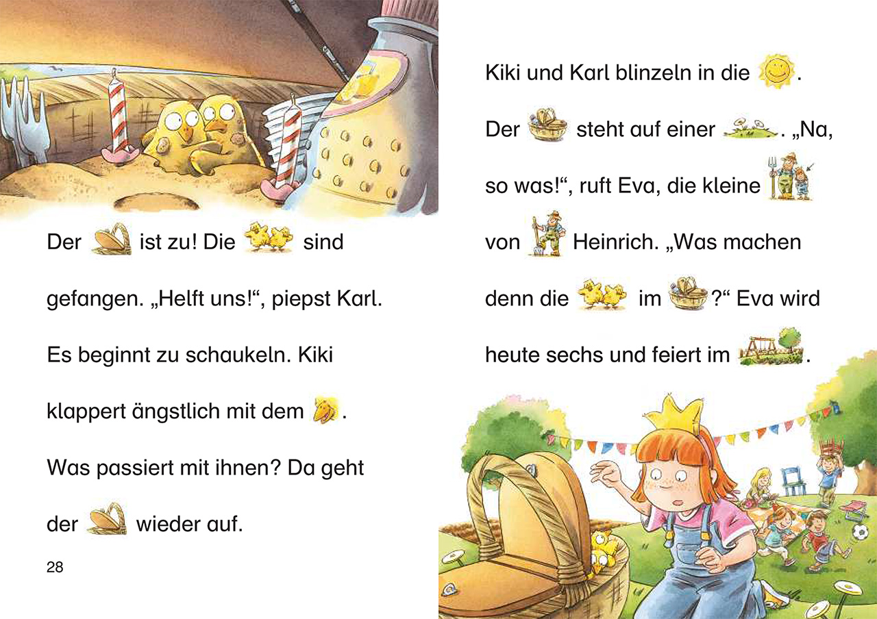 Neugierig klettern die Küken Kiki und Karl in einen Korb und sind plötzlich darin gefangen. Was sie wohl erwartet, wenn der Deckel wieder aufgeht? Auch Ferkel Fritz erlebt eine Überraschung. Eigentlich mag er es gar nicht, im Schlamm zu baden. Doch dann verrät ihm die Katze Ella einen kleinen Trick.