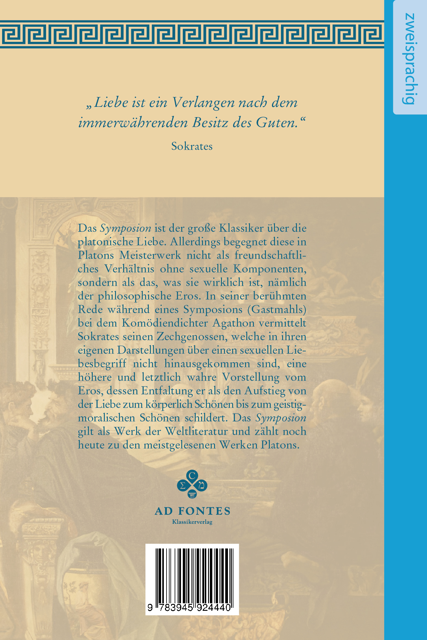 Das Symposion ist der große Klassiker über die platonische Liebe. Allerdings begegnet diese in Platons Meisterwerk nicht als freundschaftliches Verhältnis ohne sexuelle Komponenten, sondern als das, was sie wirklich ist, nämlich der philosophische Eros. In seiner berühmten Rede während eines Symposions (Gastmahls) bei dem Komödiendichter Agathon vermittelt Sokrates seinen Zechgenossen, welche in ihren eigenen Darstellungen über einen sexuellen Liebesbegriff nicht hinausgekommen sind, eine höhere und letztlich wahre Vorstellung vom Eros, dessen Entfaltung er als den Aufstieg von der Liebe zum körperlich Schönen bis zum geistig-moralischen Schönen schildert.