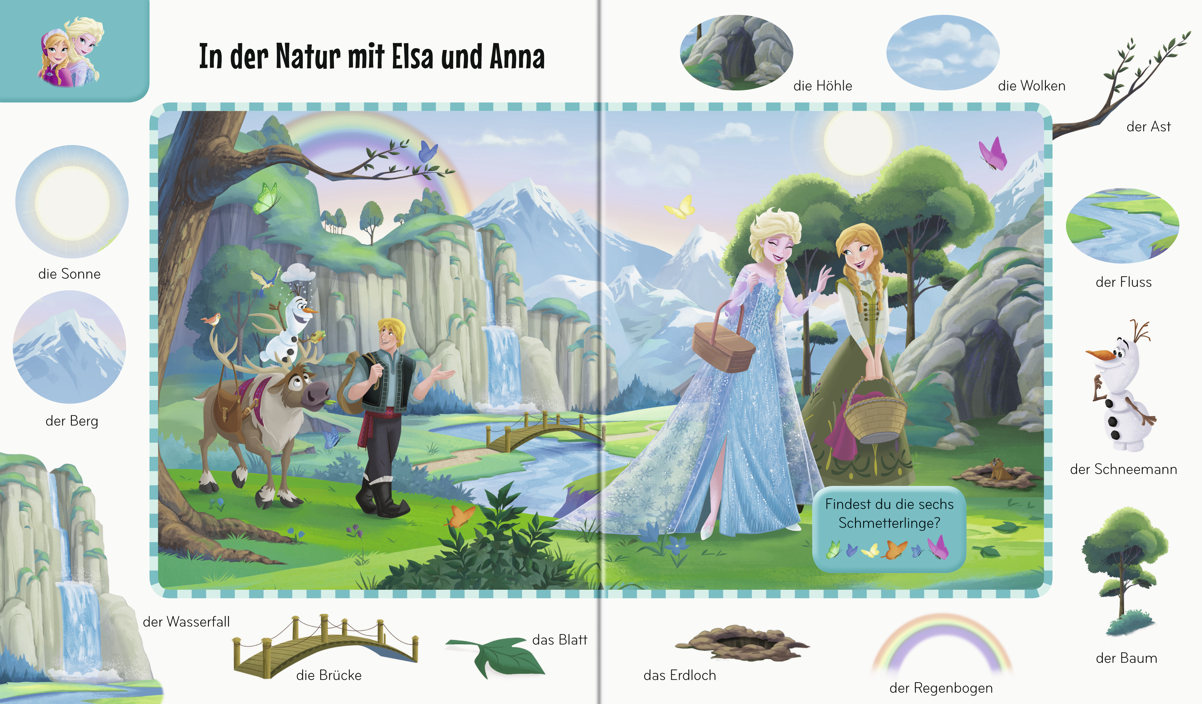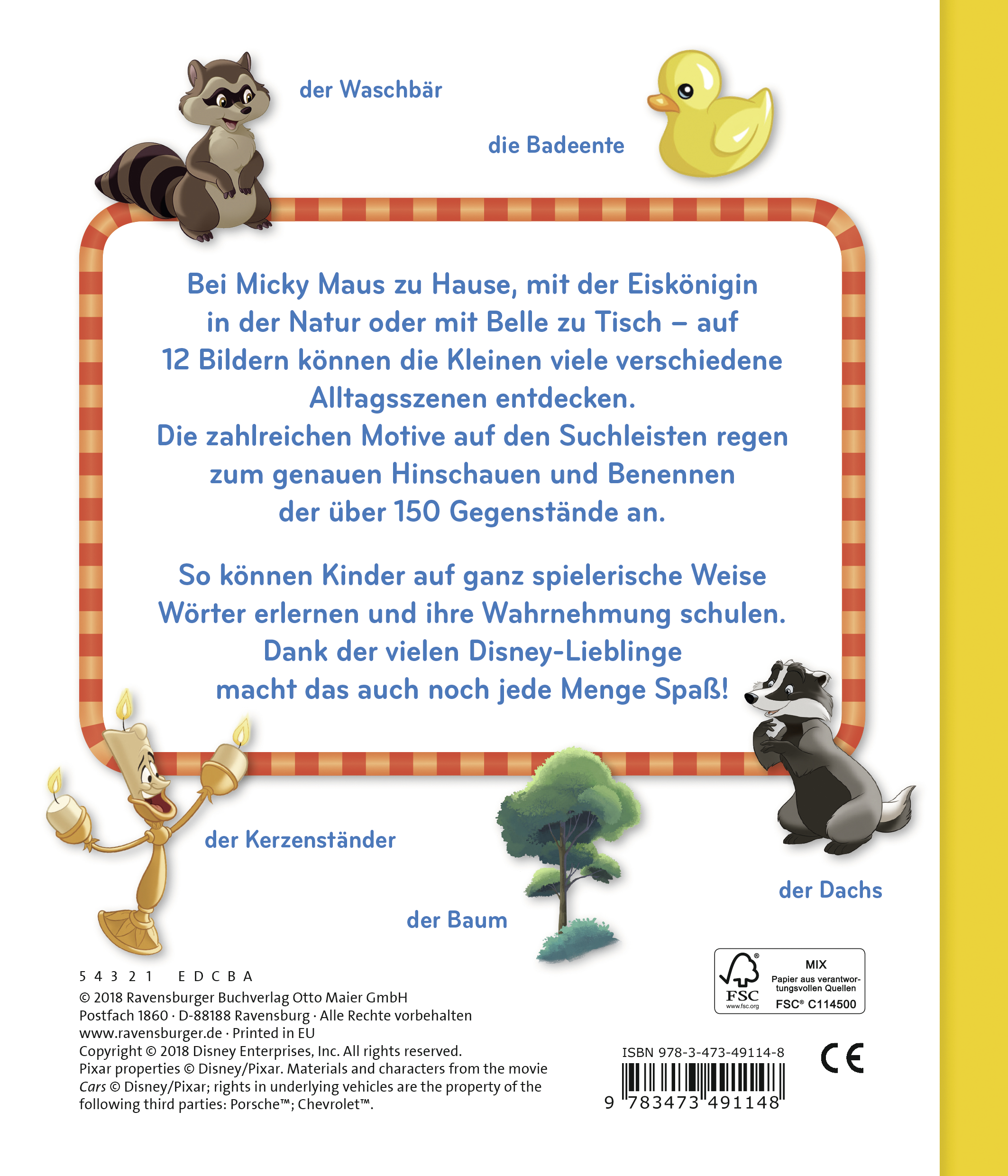 Ob Badeenten in Donalds Badezimmer oder Schmetterlinge bei Elsa und Anna: Auf 12 Bildern zu unterschiedlichen Disney-Welten gibt es für die Kleinen viel zu entdecken. In dem Buch tummeln sich über 150 Gegenstände zum Hinschauen und Benennen. Gemeinsam mit den Disney-Lieblingen wird das Wortschatz-Training so im wahrsten Sinne des Wortes zum Kinderspiel.