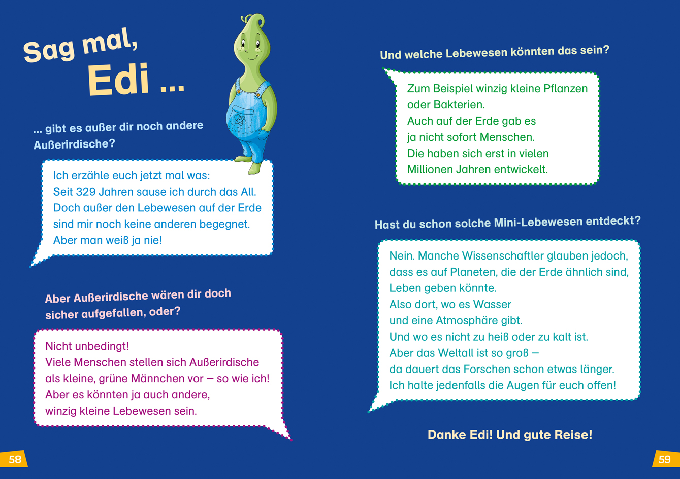 Die unendliche Größe des Universums lässt sich beim Blick zu den Sternen nur erahnen - gerade das hat bereits auf Kinder eine faszinierende Wirkung. Welche Planeten gibt es in unserem Sonnensystem? Wie ist das Weltall aufgebaut? Und was muss ein Astronaut können? Durch das Buch führt Edi, der Außerirdische, in seinem Ufo. Die große Fibelschrift und das klare Layout sind speziell für Leseeinsteiger konzipiert, im Vordergrund stehen die Übersichtlichkeit und Lesbarkeit der Texte. Alles verstanden, Neues gelernt? Das Lesequiz gibt Antwort.