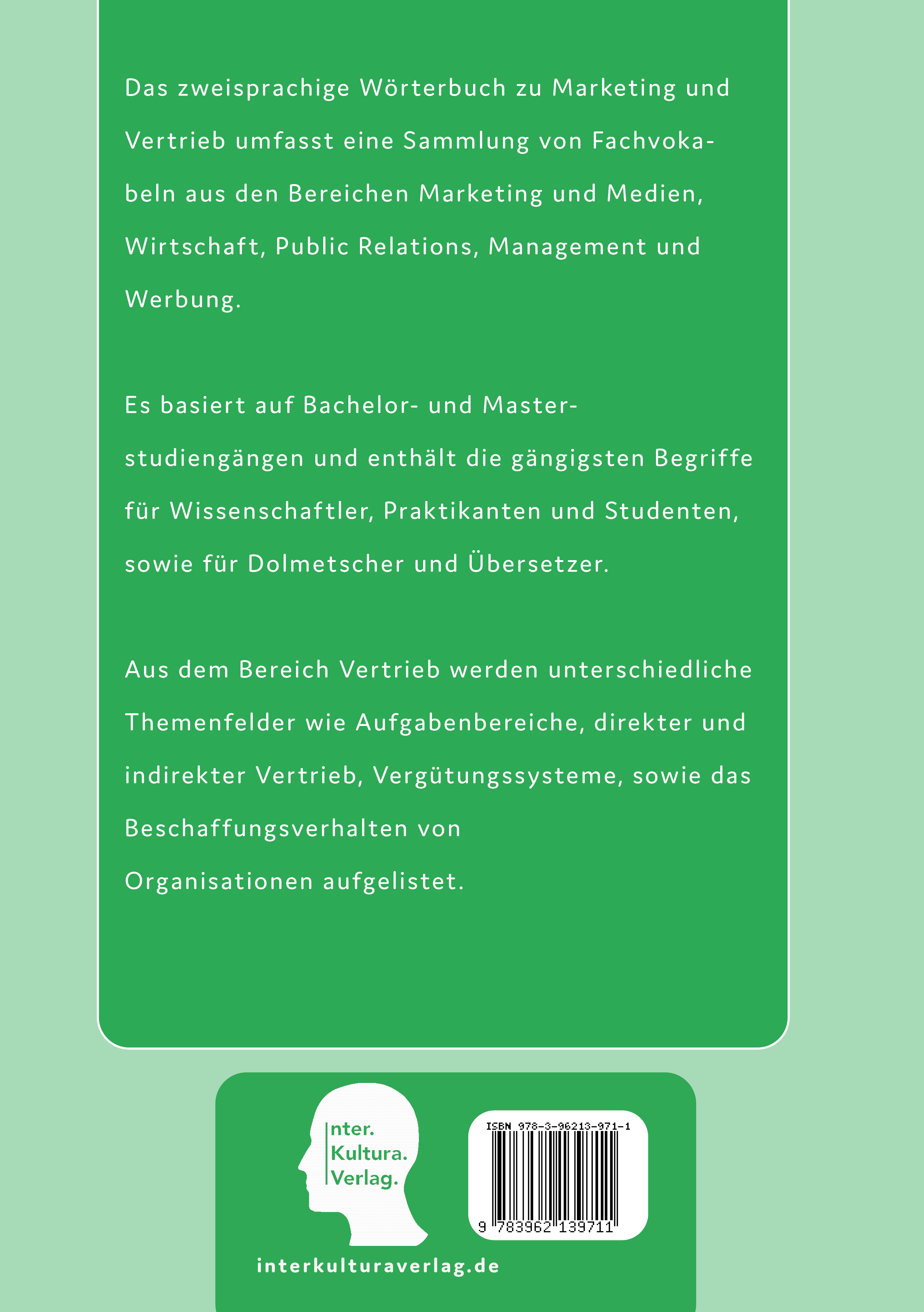 Das zweisprachige Wörterbuch zu Marketing und Vertrieb umfasst eine Sammlung von Fachvokabeln aus den Bereichen Marketing und Medien, Wirtschaft, Public Relations, Management und Werbung.Es basiert auf Bachelor- und Masterstudiengängen und enthält die gängigsten Begriffe für Wissenschaftler, Praktikanten und Studenten sowie für Dolmetscher und Übersetzer.Aus dem Bereich Vertrieb werden unterschiedliche Themenfelder wie Aufgabenbereiche, direkter und indirekter Vertrieb, Vergütungssysteme sowie das Beschaffungsverhalten von Organisationen aufgelistet.