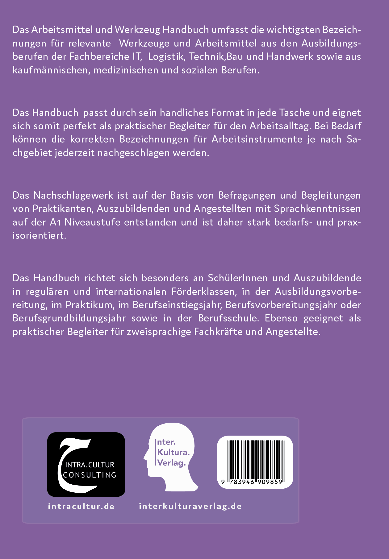 Das Arbeitsmittel und Werkzeug Handbuch umfasst die wichtigsten Bezeichnungen für relevante Werkzeuge und Arbeitsmittel aus den Ausbildungsberufen der Fachbereiche IT, Logistik, Technik, Bau und Handwerk sowie aus kaufmännischen, medizinischen und sozialen Berufen.Das Handbuch passt durch sein handliches Format in jede Tasche und eignet sich somit perfekt als praktischer Begleiter für den Arbeitsalltag. Bei Bedarf können die korrekten Bezeichnungen für Arbeitsinstrumente je nach Sachgebiet jederzeit nachgeschlagen werden.Das Nachschlagwerk ist auf der Basis von Befragungen und Begleitungen von Praktikanten, Auszubildenden und Angestellten mit Sprachkenntnissen auf der A1 Niveaustufe entstanden und ist daher stark bedarfs- und praxisorientiert.Das Handbuch richtet sich besonders an SchülerInnen und Auszubildende in regulären und internationalen Förderklassen, in der Ausbildungsvorbereitung, im Praktikum, im Berufseinstiegsjahr, Berufsvorbereitungsjahr oder Berufsgrundbildungsjahr sowie in der Berufsschule. Ebenso geeignet als praktischer Begleiter für zweisprachige Fachkräfte und Angestellte.