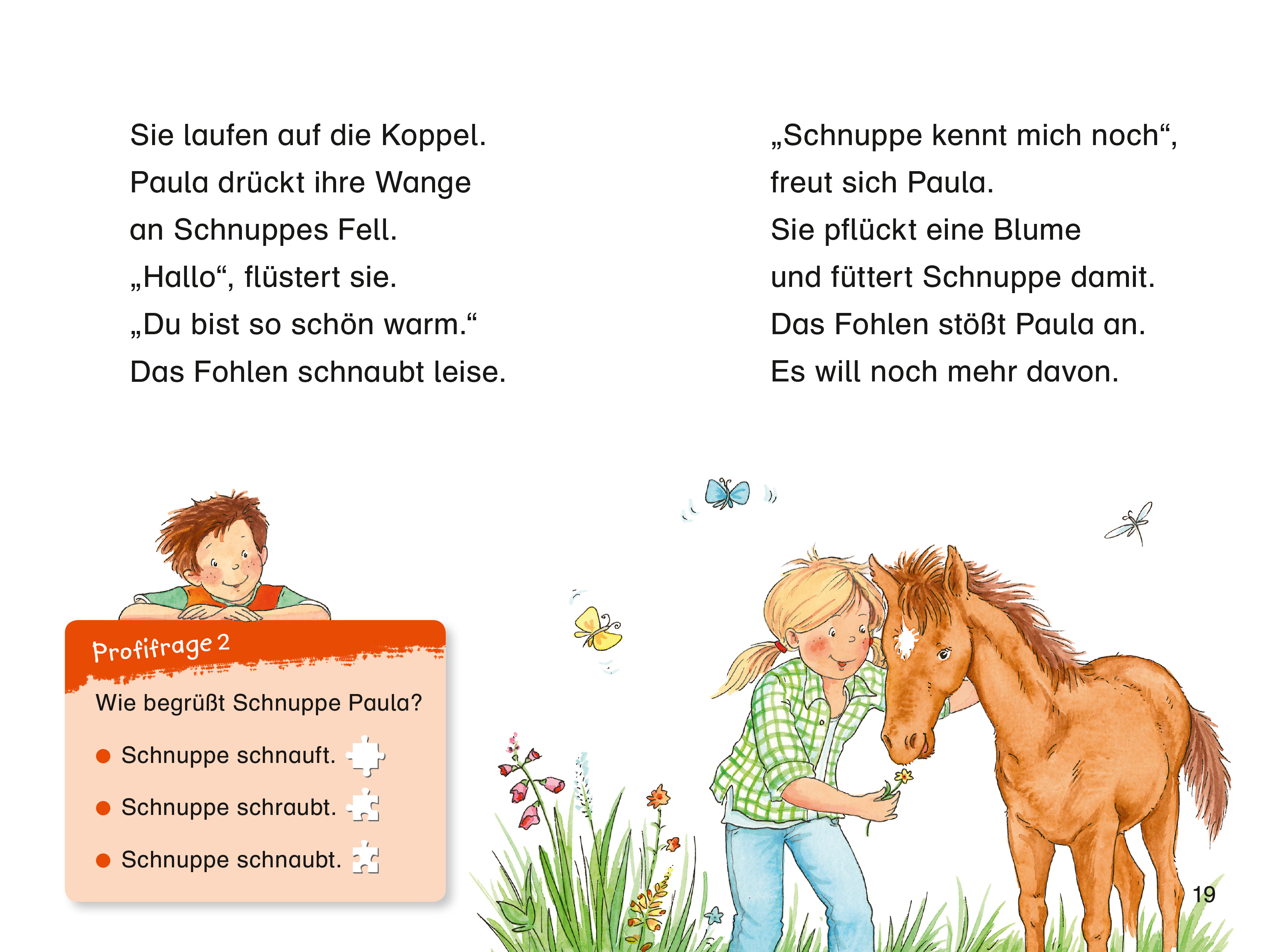 Paula darf ihr Lieblingsfohlen Schnuppe auf Tante Sabines Bauernhof besuchen! Schnuppe ist schon ein halbes Jahr alt und macht die ersten Schritte in die Selbstständigkeit. Es lernt, ein Halfter zu tragen, am Strick zu gehen und vieles mehr. Schnuppe geht jetzt sozusagen in die Schule! Und Paula darf sie unterrichten ...