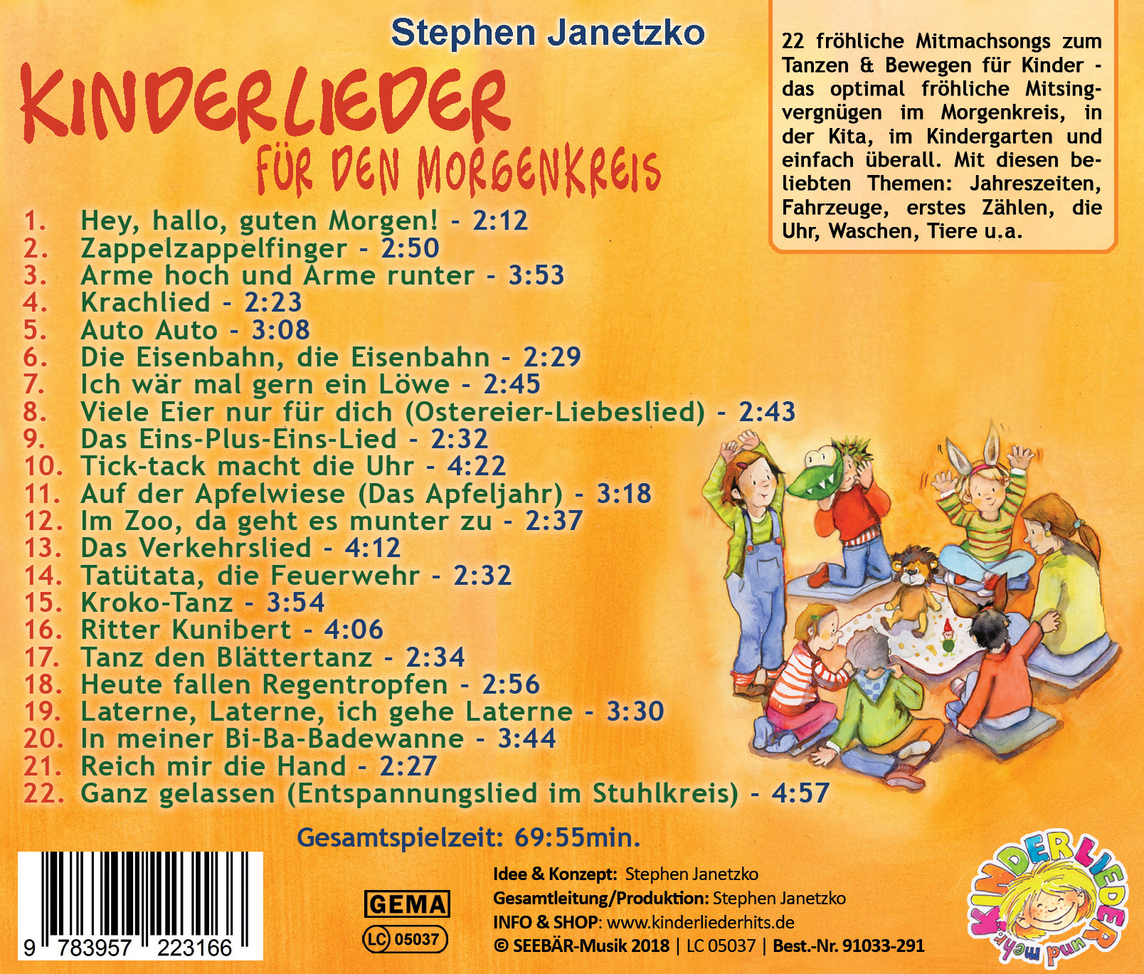 Kinderlieder für den Morgenkreis - 22 fröhliche Mitmachsongs zum Tanzen und Bewegen für Kinder - das optimal fröhliche Mitsingvergnügen im Morgenkreis, in der Kita, im Kindergarten und einfach überall. Mit diesen beliebten Themen: Jahreszeiten, Fahrzeuge, erstes Zählen, die Uhr, Waschen, Tiere u.a. Alle enthaltenen Lieder: 1. Hey, hallo, guten Morgen! 2. Zappelzappelfinger 3. Arme hoch und Arme runter 4. Krachlied 5. Auto Auto 6. Die Eisenbahn, die Eisenbahn 7. Ich wär mal gern ein Löwe 8. Viele Eier nur für dich (Ostereier-Liebeslied) 9. Das Eins-Plus-Eins-Lied 10. Tick-tack macht die Uhr 11. Auf der Apfelwiese (Das Apfeljahr) 12. Im Zoo, da geht es munter zu 13. Das Verkehrslied 14. Tatütata, die Feuerwehr 15. Kroko-Tanz 16. Ritter Kunibert 17. Tanz den Blättertanz 18. Heute fallen Regentropfen 19. Laterne, Laterne, ich gehe Laterne 20. In meiner Bi-Ba-Badewanne 21. Reich mir die Hand 22. Ganz gelassen (Entspannungslied im Stuhlkreis) Gesamtspielzeit: ca. 69:55 min.