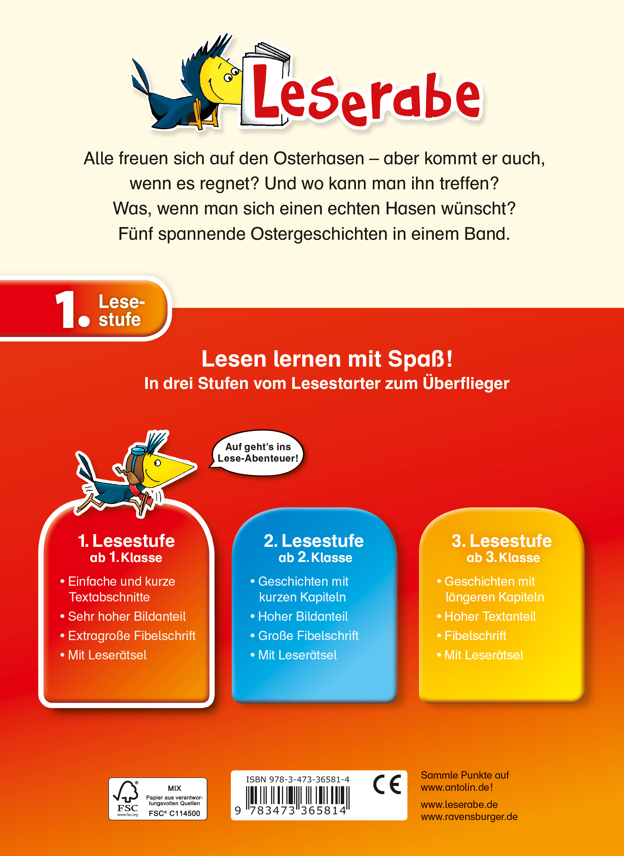 Lesen lernen wie im Flug! Die Kinderbücher der Reihe Leserabe - 1. Lesestufe wurden mit Pädagogen entwickelt und richten sich an Leseanfänger ab der 1. Klasse. Kurze Texte in großer Fibelschrift sichern erste Leseerfolge und steigern die Lesekompetenz von Mädchen und Jungen ab 6 Jahren. Empfohlen von Stiftung Lesen, gelistet bei Antolin.