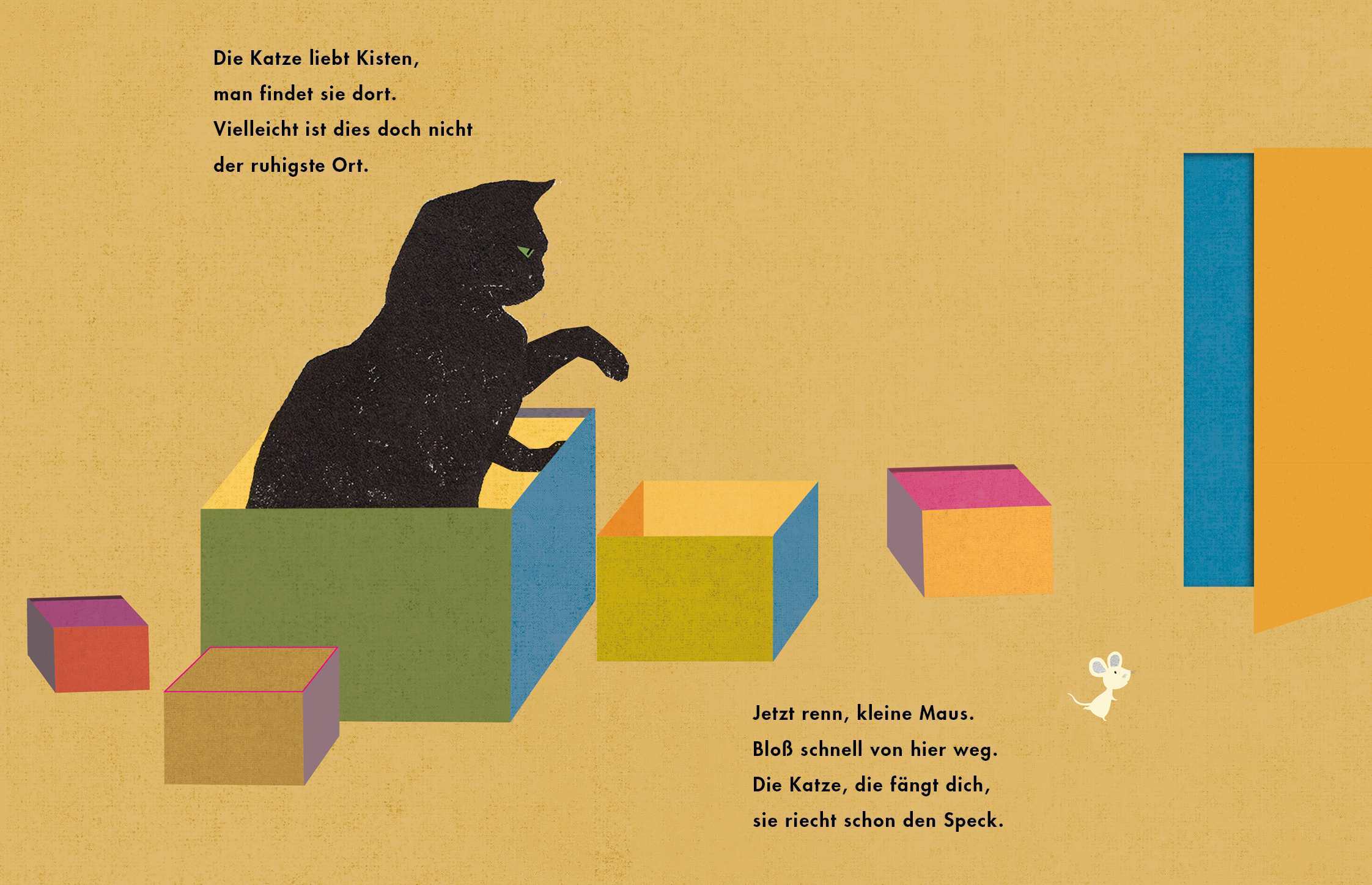 »Hinterher! Die Katze jagt die Maus. Klar. "Katze und Maus" macht daraus ein Kinderspiel. Lerneffekt: in, auf, unter genau benennen und ihr tolles Versteck zeigen.«