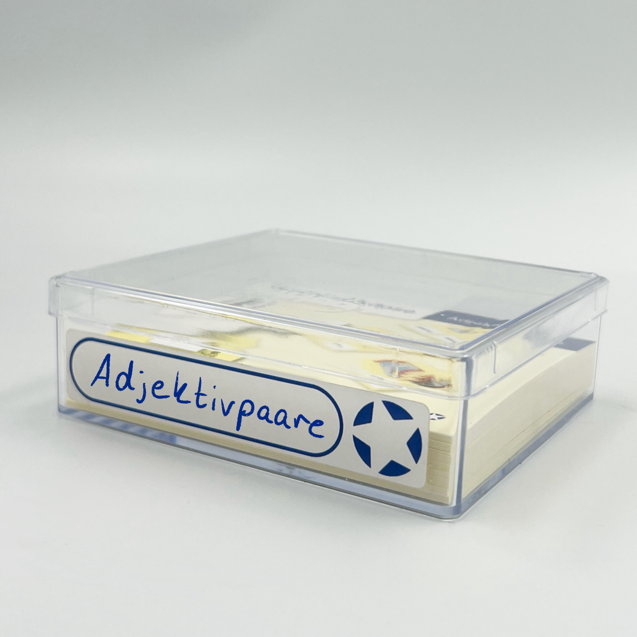 24 Adjektivpaare als Bildkarten und 48 Wortkarten mit rückseitiger Selbstkontrolle in der Box und Etikett gratis