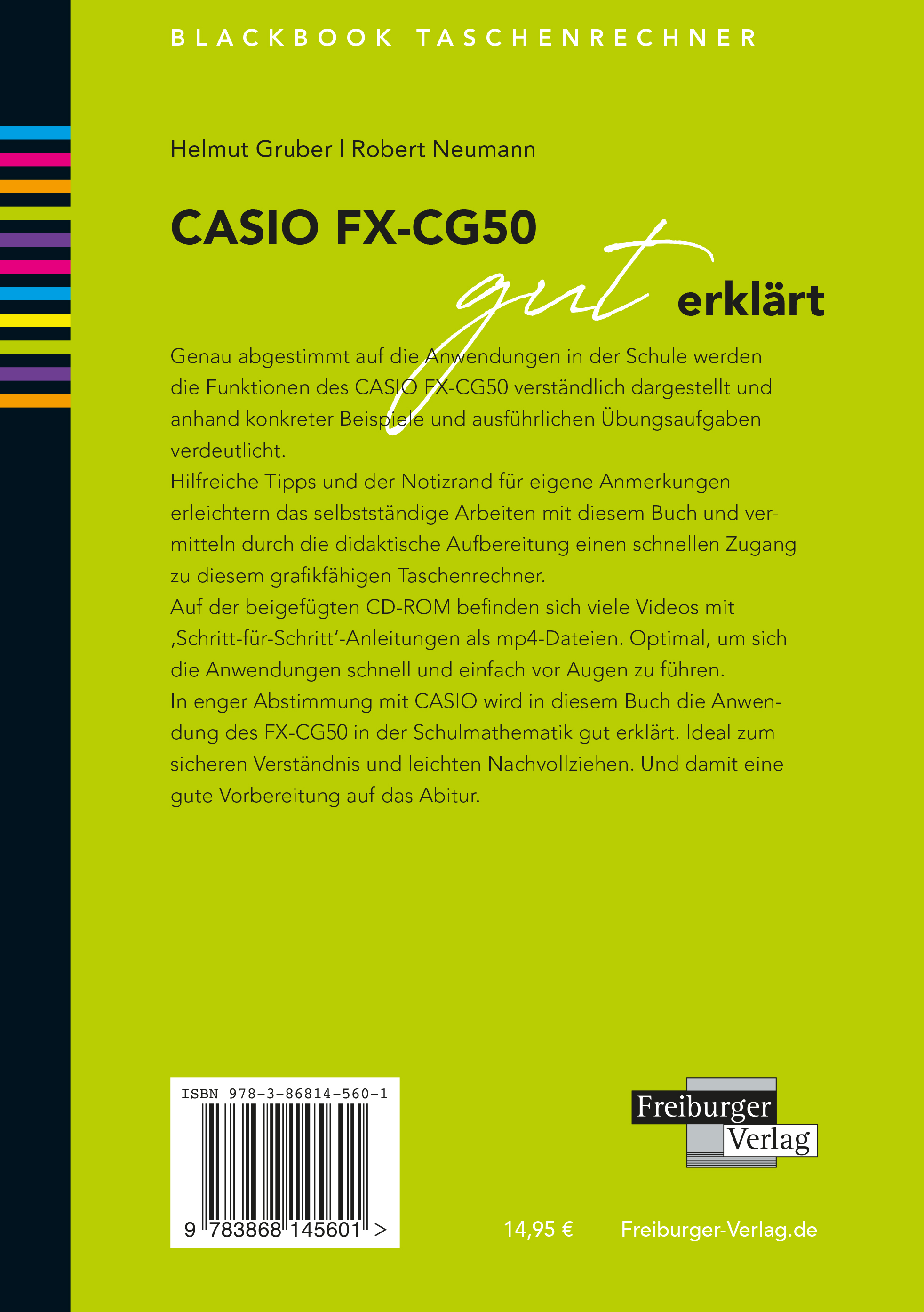 CASIO fx-CG50 gut erklärt Genau abgestimmt auf die Anwendungen in der Schule werden die Funktionen des CASIO FX-CG50 verständlich dargestellt und anhand konkreter Beispiele und ausführlichen Übungsaufgaben verdeutlicht. Hilfreiche Tipps und der Notizrand für eigene Anmerkungen erleichtern das selbstständige Arbeiten mit diesem Buch und vermitteln durch die didaktische Aufbereitung einen schnellen Zugang zu diesem grafikfähigen Taschenrechner. Auf der beigefügten CD-ROM befinden sich viele Videos mit 'Schritt-für-Schritt'-Anleitungen als mp4-Dateien. Optimal, um sich die Anwendungen schnell und einfach vor Augen zu führen. In enger Abstimmung mit CASIO wird in diesem Buch die Anwendung des FX-CG50 in der Schulmathematik gut erklärt. Ideal zum sicheren Verständnis und leichten Nachvollziehen. Und damit eine gute Vorbereitung auf das Abitur.
