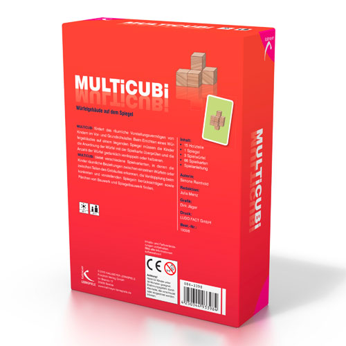 Schau in den Spiegel! Dein Bauwerk wächst nach oben und unten!Wenn man ein Würfelgebäude auf einem liegenden Spiegel aufbaut, dann ist dieses Würfelgebäude auch im Spiegel sichtbar.MULTICUBI fördert das räumliche Vorstellungsvermögen von Kindern im Vor- und Grundschulalter. Beim Errichten eines Würfelgebäudes auf dem Spiegel müssen die Kinder die Anordnung der Würfel mit der Spielkarte überprüfen und die Anzahl der Würfel gedanklich verdoppeln oder halbieren.MULTICUBI bietet verschiedene Spielvarianten, in denen die Kinder räumliche Beziehungen zwischen einzelnen Würfeln oder zwischen Teilen des Gebäudes erkennen, die Verdopplung beim konkreten und vorstellenden Spiegeln berücksichtigen sowie Pärchen von Bauwerk und Spiegelbauwerk finden.Inhalt:10 einzelne Holzwürfel1 Puzzleset Holzwürfel (2 Einzelwürfel, 1 Würfelzwilling, 2 Würfeldrillinge)1 Spiegel3 Spielewürfel66 Spielekarten
