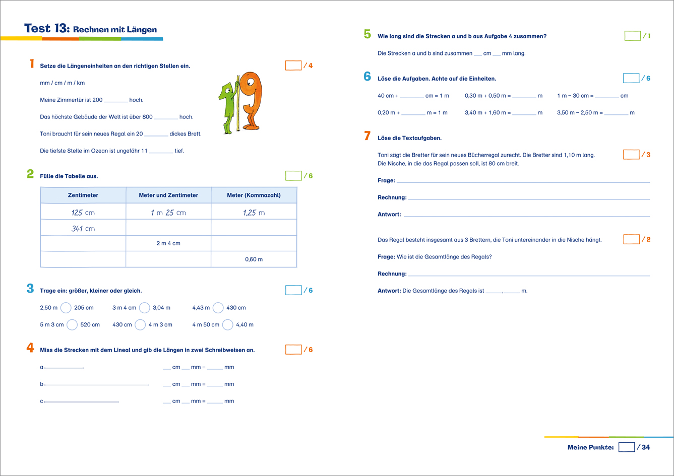 Mit diesen Tests werden Rechnen, Sachaufgaben und Geometrie zum Kinderspiel. 20 verschiedene Übungstests zu allen Mathematik-Themenbereichen der dritten Klasse helfen, Gelerntes zu verfestigen und zu wiederholen. Mit Lösungsblatt zum Herausnehmen. Durch die Punkteverteilung lässt sich leicht ablesen, welche Note der Test ergeben hätte.